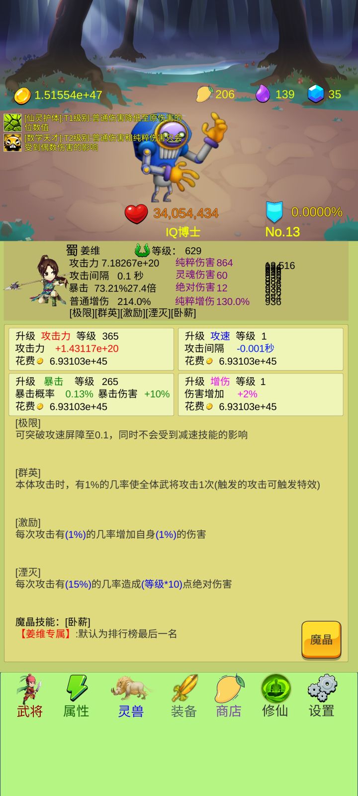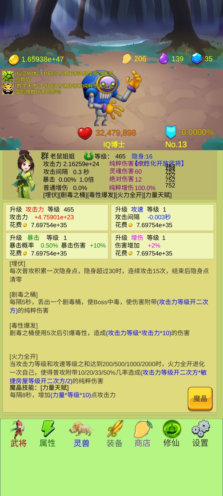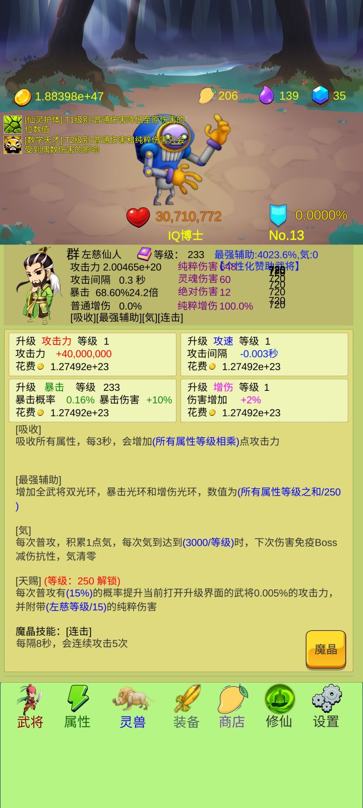 6 自动升级时候会发现一个问题,10关以后打的也快,反而7/10关会卡顿。是因为手动会点属性,而属性加成,对7-10关伤害会有很大影响。怎么加快前面7-10的速度呢,依旧还是,连击左慈老鼠,专属貂蝉。还有能量甄姬。这四个输出。然后全力升级商店,贪婪,炼金。运动鞋(灵魂魔晶不多就主升这三个)。暗黑之剑 射日神弓,至尊法杖。等等级上来就好很多了。至于在这个过渡阶段,可以手动升属性,一次升100级那个,力量,敏捷,智力点一下就可以了