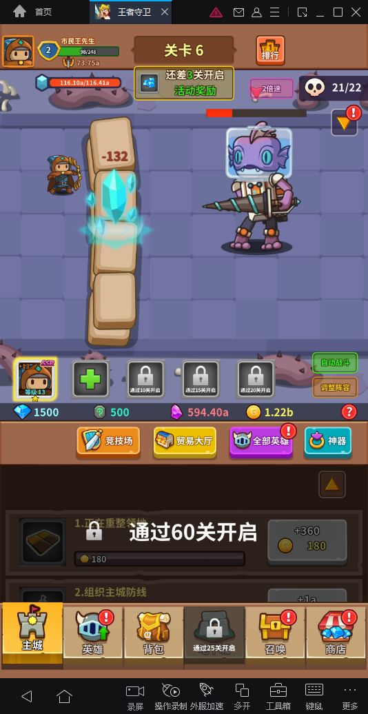 领主大人,我们又又又来了。新一轮测试开启了,这次主要更新的内容很多“1、 防作弊!防作弊!防作弊!2、 取消了20关以前的视频广告,收益可以直接领了。3、 干掉了点断手的主城任务们,改成了只有三个主城任务:分别产出金币、强化石、钻石。4、 增加了离线奖励宝箱,隔几分钟就能领一次,八小时攒满。5、 增加了通关马车,没时间挂机的领主可以试试坐马车速通。不过目前战力限制有点狠,接下来的版本我