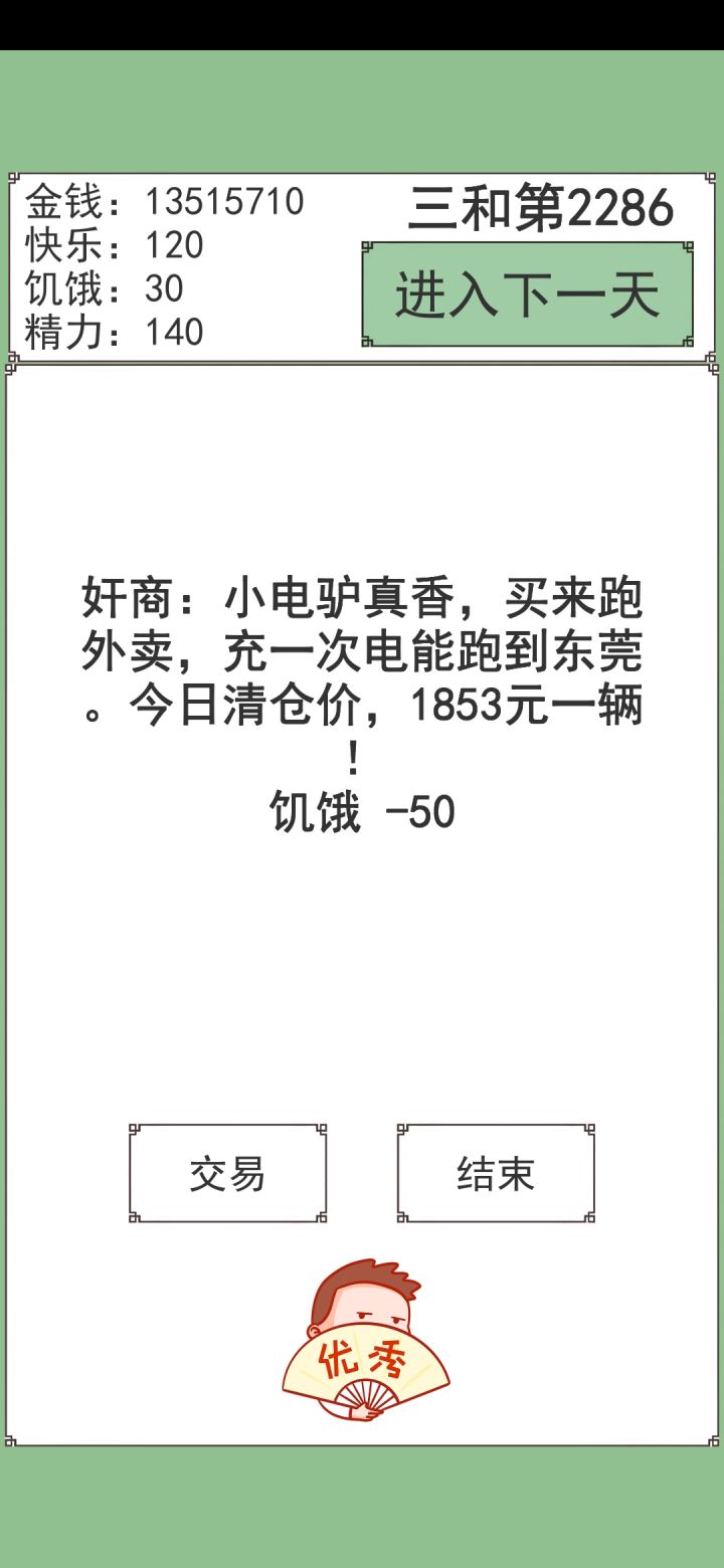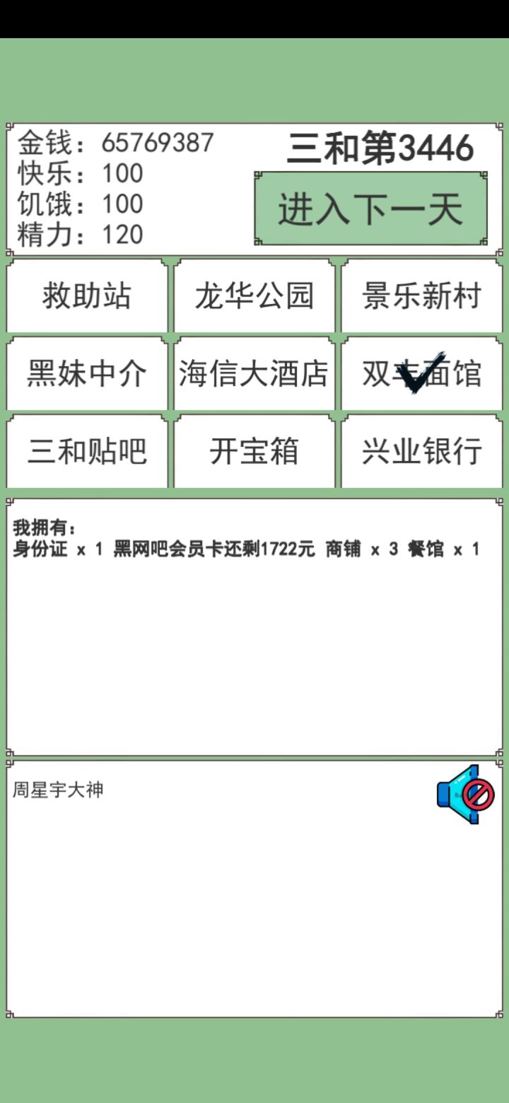 手残点多一下饿死了总的来说就是个倒卖游戏前期打工有个两三千开始倒卖证稍微有点钱开始小电动后期有钱买公寓和汽车(饥饿和快乐-100也没事,超了就没了)