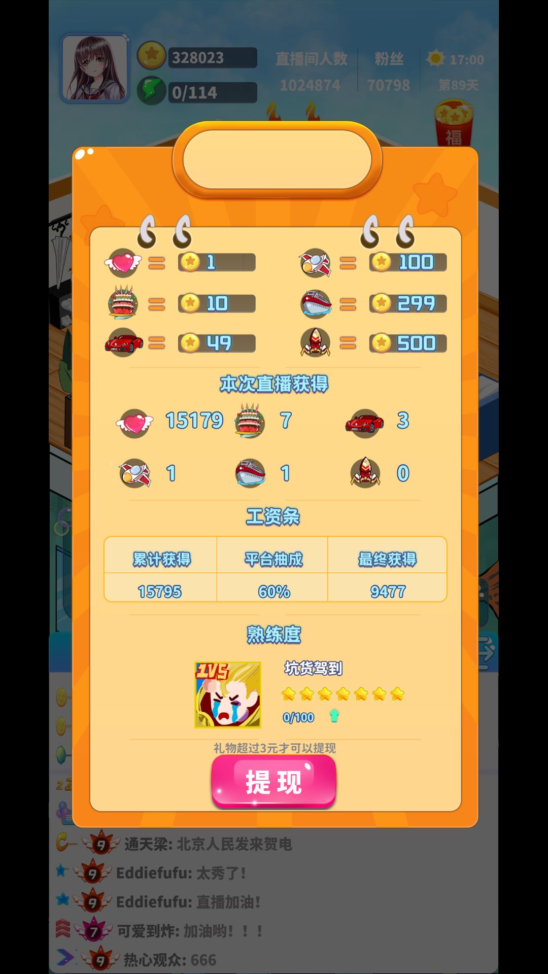 89天百万人气主播攻略 进入游戏选女孩 第一天选择才艺 直播类容选择有热度的就行 直播时选择与黑粉吵架 第一次房租500还完后不要乱花存着 十多天的时候有个选择,选禁言黑粉 有了你丫闭嘴这个天赋后优先禁言 19天的10000块拿了别花20天要还的 如果21天还完钱还有两千块左右的话可以外出去迪吧学跳舞,选250一次的,学会三种初级的就够用了。 现在直播就可以播三种了,单机,网络,舞蹈。每天随机两种加热度,我们这边能播三种,也就等于每天都能播有热度的。单机只需要买3个游戏500一个。 后面到45天前都可以直播完后外出去买衣服 身上留一千40天左右要交房租, 注意有你丫闭嘴这个天赋后先禁言黑粉 然后衣服买完了可以右滑,电子商城还有装备可以买。 45天就可以先不买东西了存钱50还两万。 50天以后继续买,买完,在存钱还65天的*天以后赚钱就很快了,在存够80天所需要的70000后就可以选择去医院做基因改造了。 最后到89天的时候,保证智商130,体力114 就可以达到直播间人气百万。 89天直播操作细节,直播开始直接禁言,要手速够快, 前13条弹幕全部禁言,不要漏,如果漏了退出重进。 这样最后一点体力用完刚好一百万人气。 提示在直播过程中,尽量把黑粉控制在铁粉的百分之八十左右,黑粉超出了百分之八十则优先吵架,如果没有就优先禁言。