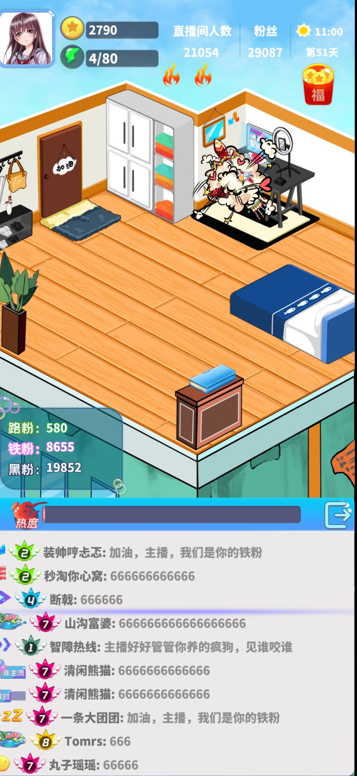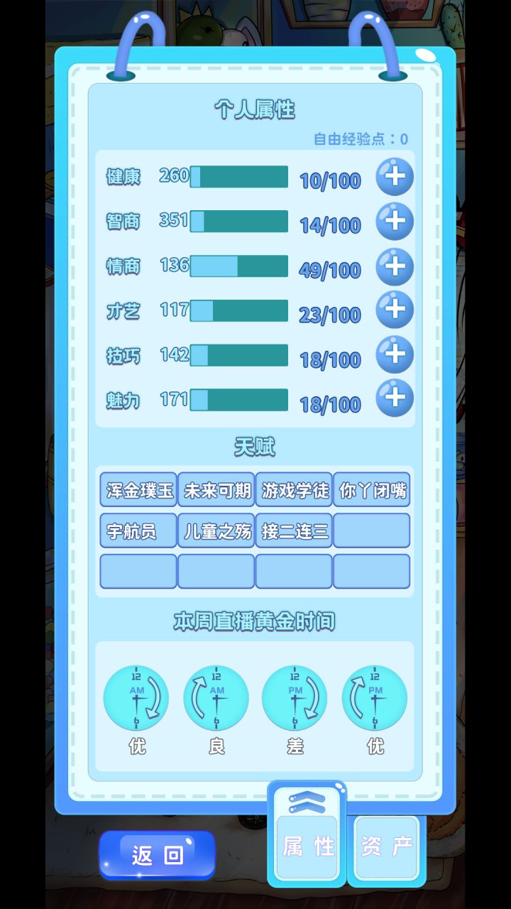 挺好玩的啦,其实。但是我觉得还有几点需要改进比如那个时间。我每次只能一起床,早上六点就开直播。因为我不晓得怎么让时间尽快到达下午除非我出去学习技能。但是,我学完技能之后就没有多少体力了。然后呢,就是黑粉的问题。我看了眼评论区。黑粉的话呢,你需要点击它这一条。然后从右边的四个选择第一个或者第四个。然后黑粉数就会减少10%。但是你要是点错了。点成了第二个跟第三个。也没有关系。只