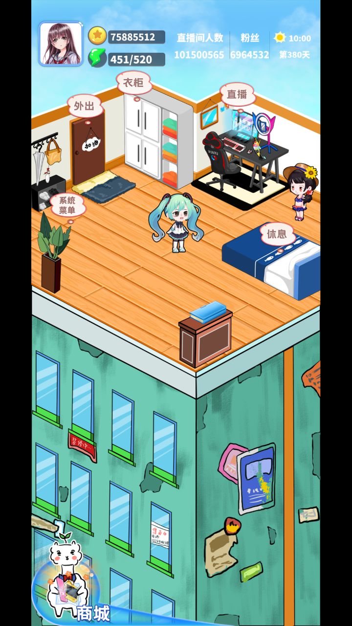 创意超级棒的游戏!直播的时候看着各种弹幕和送礼物可太有趣了!一共玩了三遍才通关。第一次挂在了榜一大哥送1w,然后花掉了,谁知道这个坑货居然是个小孩,过两天他麻麻会回来跟你要回去,要是花掉了会直接破产!第二次是一直兢兢业业的直播然后出去学习,这各部分是真的很不合理,因为学习的支出和收获完全不对等。然后最后存不够钱挂掉了。第三次终于摸索到了诀窍,根本不要出去学习!!就硬存钱把衣服和电子设备搬
