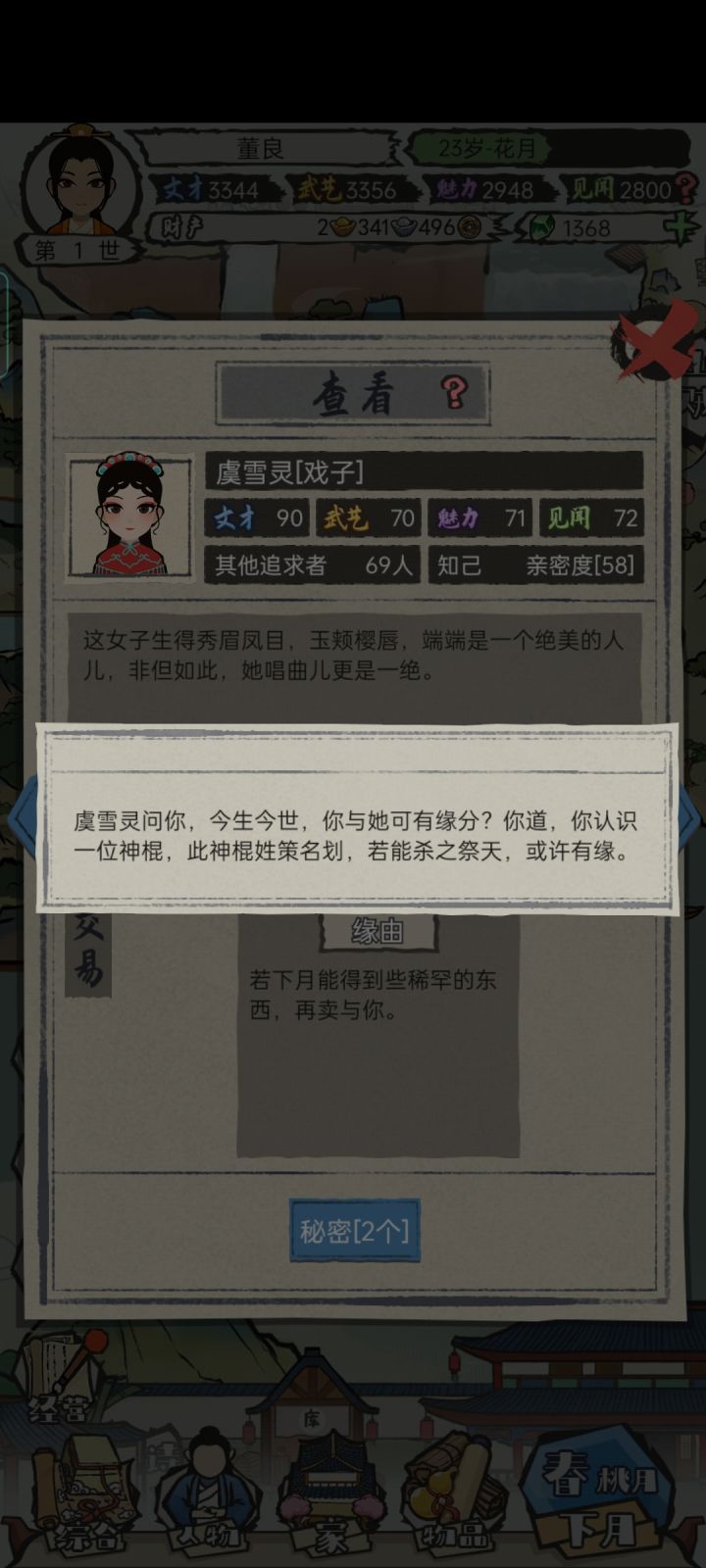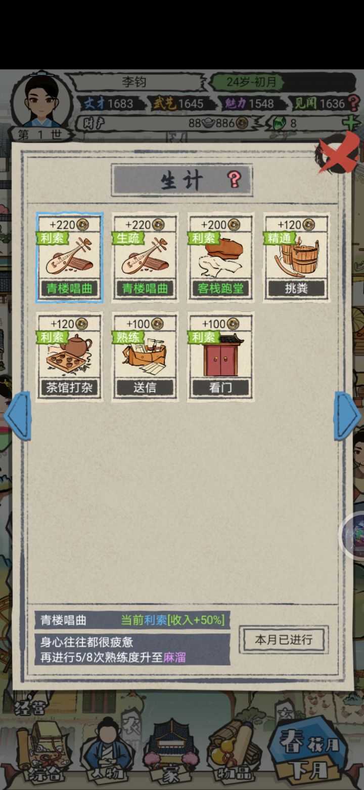 前期讨好刘冬梅得了份跑堂的差事,200文钱美滋滋!讨好刘强风能得个信差的工作还有史大叔这几npc我都是重点关注的,这几个npc这里能买鱼鸡鹅,虽然感觉银子好像没啥用,厨娘那也可惜了,前期没挡住山贼还亏了几十两银子集市这是重要的宝石来源,前期得到的物品可以卖掉换宝石去学文习武,提升自己的文才还有武艺,魅力和见闻是作词和外出提的,还有跟npc搞好关系也能提升属性更夫这里能买到大白鹅丫鬟这里能