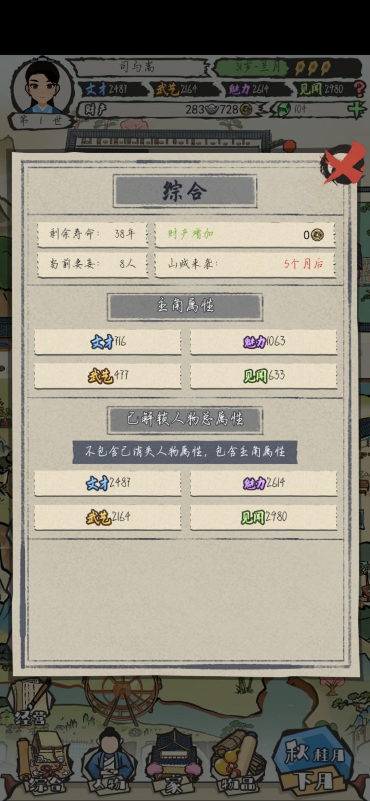 前期讨好刘冬梅得了份跑堂的差事,200文钱美滋滋!讨好刘强风能得个信差的工作还有史大叔这几npc我都是重点关注的,这几个npc这里能买鱼鸡鹅,虽然感觉银子好像没啥用,厨娘那也可惜了,前期没挡住山贼还亏了几十两银子集市这是重要的宝石来源,前期得到的物品可以卖掉换宝石去学文习武,提升自己的文才还有武艺,魅力和见闻是作词和外出提的,还有跟npc搞好关系也能提升属性更夫这里能买到大白鹅丫鬟这里能