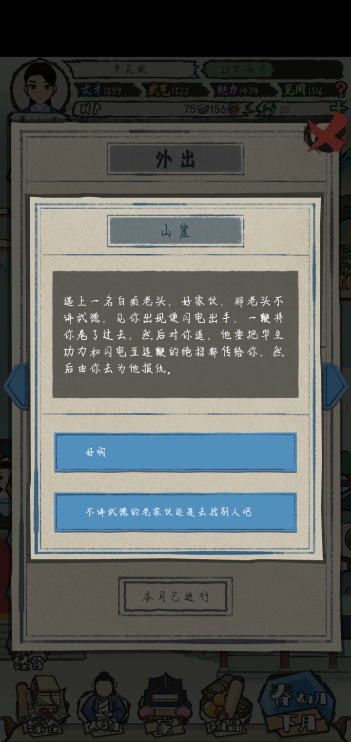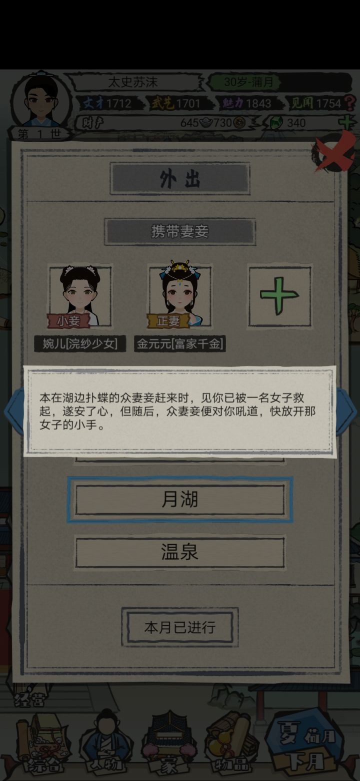 前期讨好刘冬梅得了份跑堂的差事,200文钱美滋滋!讨好刘强风能得个信差的工作还有史大叔这几npc我都是重点关注的,这几个npc这里能买鱼鸡鹅,虽然感觉银子好像没啥用,厨娘那也可惜了,前期没挡住山贼还亏了几十两银子集市这是重要的宝石来源,前期得到的物品可以卖掉换宝石去学文习武,提升自己的文才还有武艺,魅力和见闻是作词和外出提的,还有跟npc搞好关系也能提升属性更夫这里能买到大白鹅丫鬟这里能