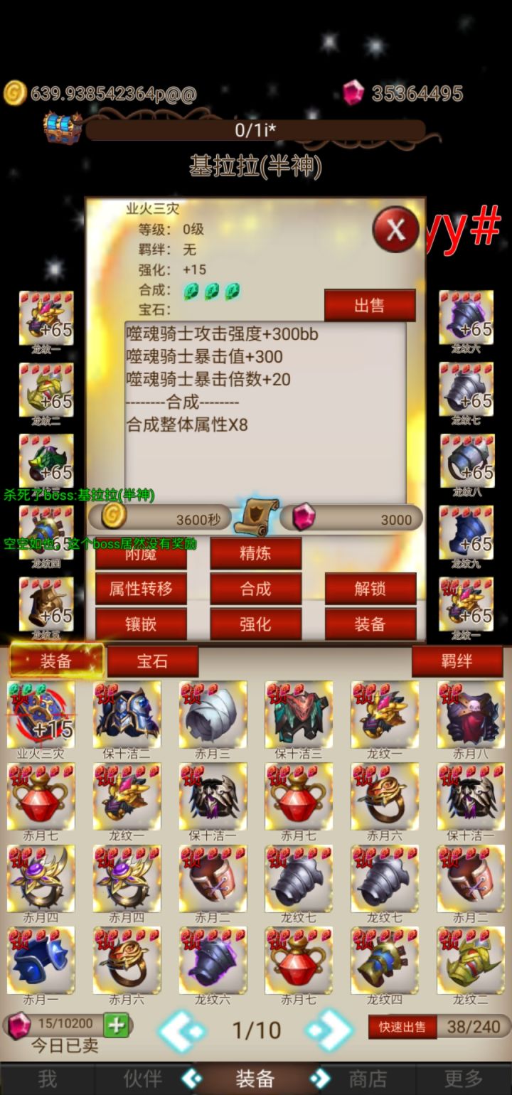 只强化到10,简单的算了一下,1+2+4+8+16+32+64+128+256+512+1024+2048+4096+8192+16384=32767本人没有抽到过8以上的装备,目前装备只强化到10。不知道10后面的数据是不是这样计算。按照魔血套装,挂机一小时差不多100件背包满。早上7点收一波,到晚上11点(本人早上8点上班)一天极限收17次,极限1700件。一件强15需要17.27