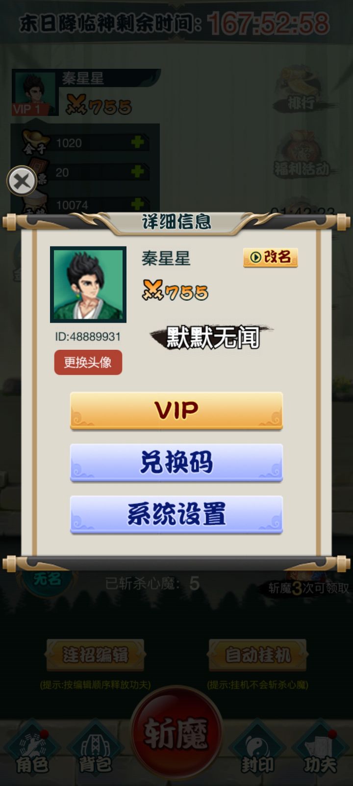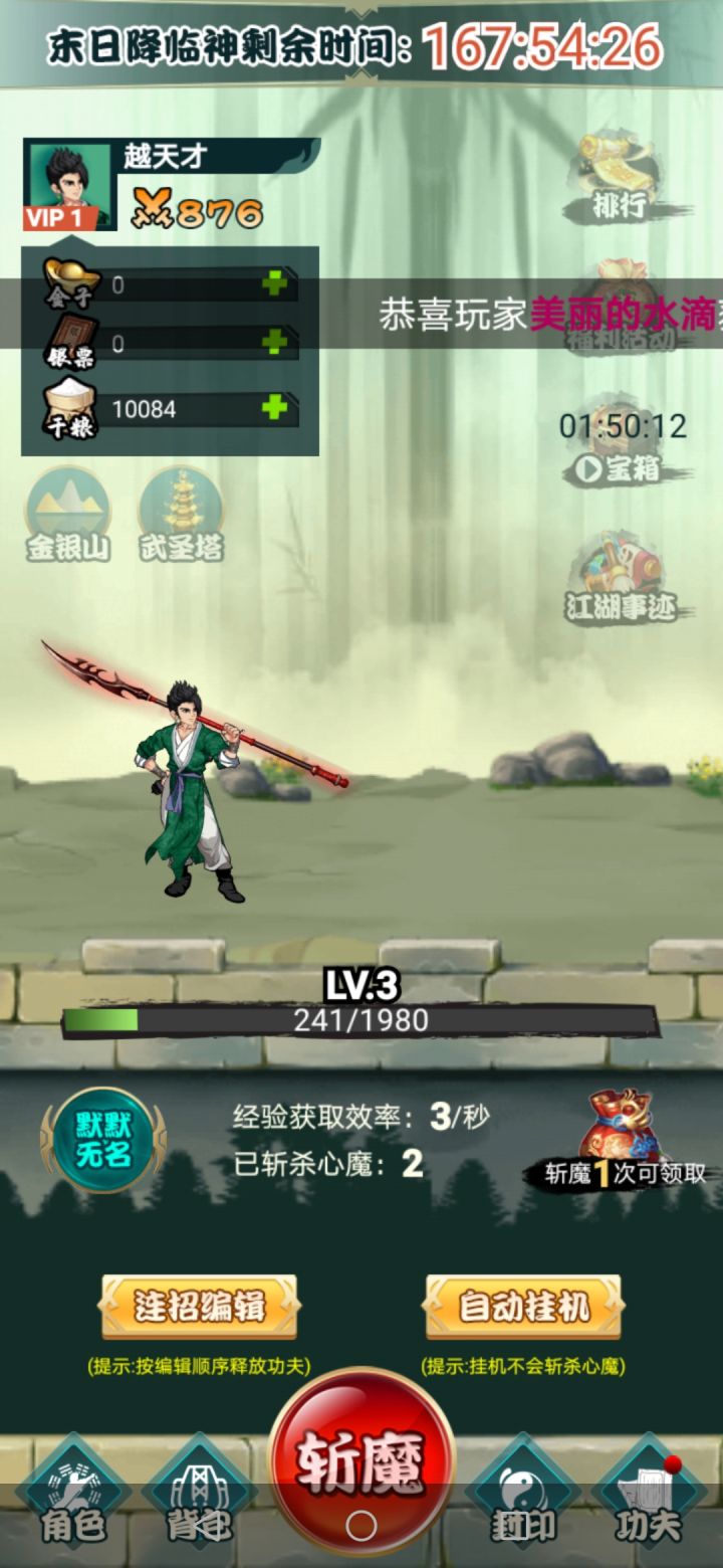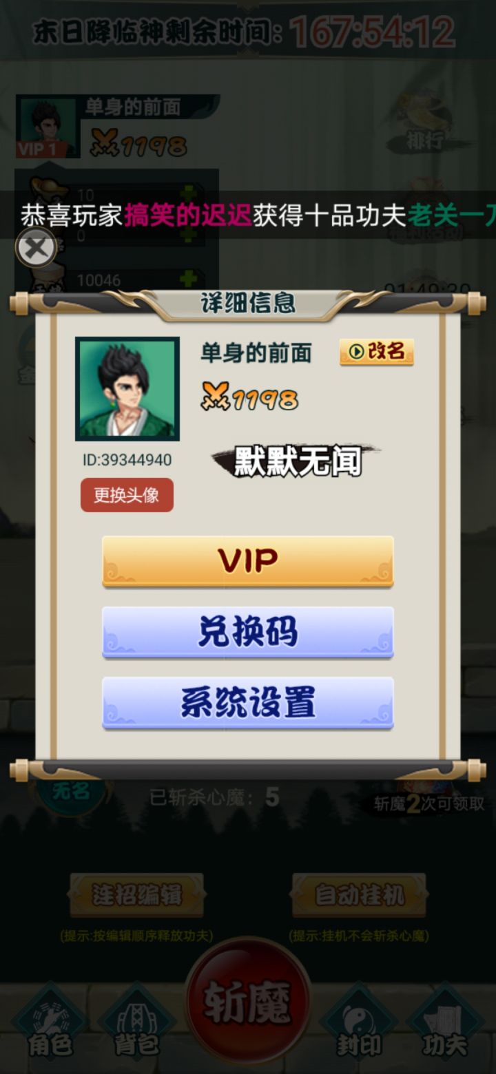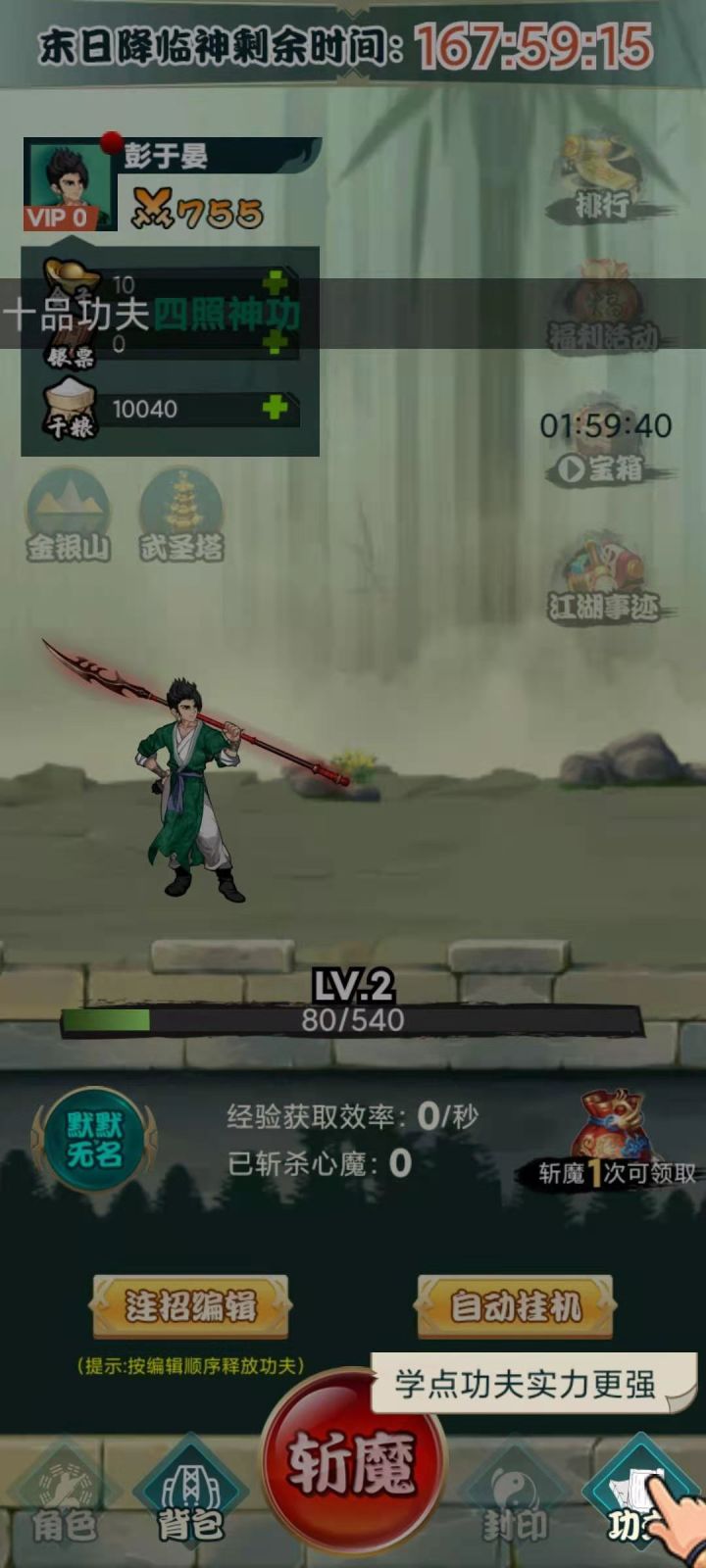 游戏是不氪金的游戏,功夫题材自由搭配这个亮点,希望功夫越来越多。上班族最爱,不肝就是好。