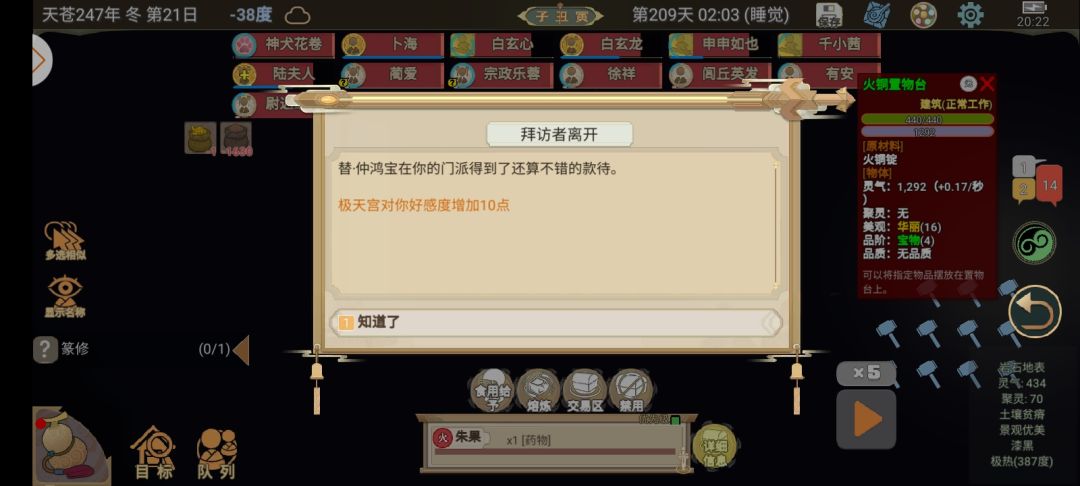1.灵植种植 灵植对温度,肥沃,灵气都有一定要求。灵植占地面积是3*3,所以我们要盖房间围住它的时候,尽量留出一圈的面积,放聚灵物或者其他改变温度的材料。 比如五色金莲,我们可以扔几个玄牝珠进去,把水属性聚灵,低温度环境都创造出来。 赭黄精,朱果,五色金莲这三个是最容易控制养殖环境的,新人可以从这里入手。 如果老是出现“肥沃不适”“温度不适”,可以对灵植使用甘霖求和御木诀,可以大幅度促进灵植生长,