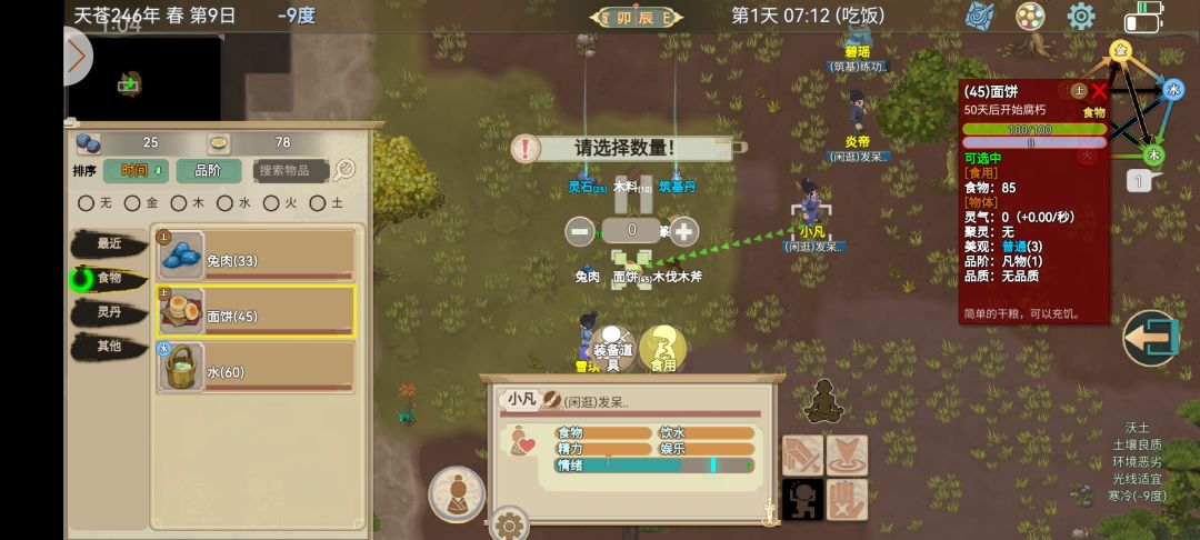 上一期我们讲了如何看物品信息以及食物的重要性,这一期我们就讲下…… 开始游戏物资里有筑基丹,这颗筑基丹可以先不吃,留着后面结丹时吃。这里我们定下个小目标,在113天后的昆仑法会前结一品金丹!萌新一定要记住,不要去追求极速的结丹攻略,这是大忌。我们的节奏越慢越好,随着游戏任务进程去进行,这样会玩的非常舒适 萌新空杯心态是最好的游玩状态,依靠自身理解去不断克服困难这样你会有满满的成就感。在这之前杯子里