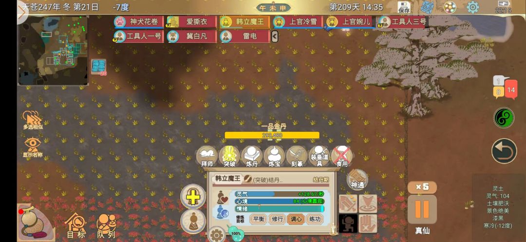 先讲正常的一品金丹 随便拿两个小人,我这挑两匹配功法不是很高的,增加点难度。 刚进内门700多灵气 全部学完技能,有1.4w灵气 如图吃药,紫毁需要化伤术治疗,或者五方化伤丹,造化神丹也行。 吃完药就有两万灵气 吃上灵石和聚灵丹,结丹 如视频还没一品,不慌 如视频多爆几次灵即可,另外还能通过娱乐里面建筑点燃烟花*9可以触发春节彩蛋,增加小地图灵气值,以及仙人庇佑也行。 图中是我用两仪功法所以双一品