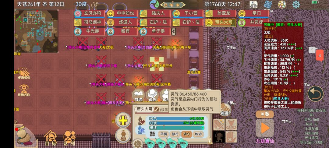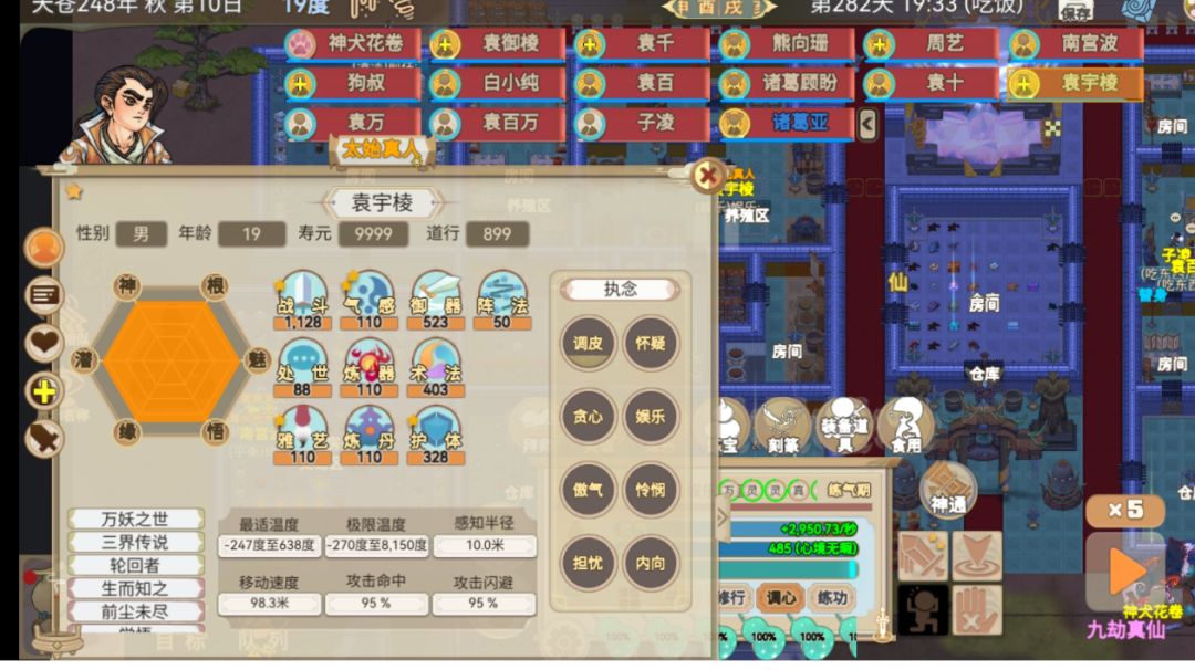 首先强调,正常游戏,未卡任何bug,全程未使用任何邪道手段,因为天道异动的影响导致后期不得不选了个十倍消耗必定淬炼成功,导致我挑衅百蛮山无数次,门派声望刷到900亿,只为刷劫灰。 培养的十思绪仙修老虎,工具人历三世做了一套心境寄托套,大哥自己历四世,自己做的符修寄托套。 第五世正式起飞(有个天道异动词条是更少的耐药性,寿元百倍消耗)功法和部分丹药宝物(全部圣品)拉满后,到了8万多灵气,又吃了些