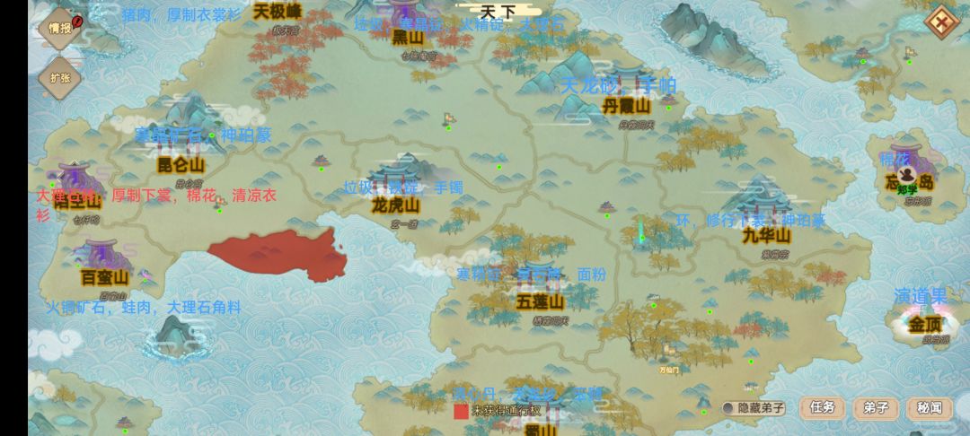 名称:万仙 大地图 掌门喜好 金顶:演道果 蜀山:清心丹,天龙砂,玉髓 九华山:环,修行下裳,神珀篆 忘形岛:棉花 五莲山:寒精锭,灵石砖,面粉 丹霞山:天龙砂,手帕 龙虎山:垃圾,铁锭,手镯 黑山:垃圾,寒晶锭,火精锭,大理石 天极峰:猪肉,厚制衣裳衫 昆仑山:寒晶矿石,神珀篆 陷空山:大理石砖,厚制下裳,棉花,清凉衣衫 百蛮山:火铜矿石,蛙肉,大理石角料 万妖殿:紫布 天道异动篇 开局天道 丹