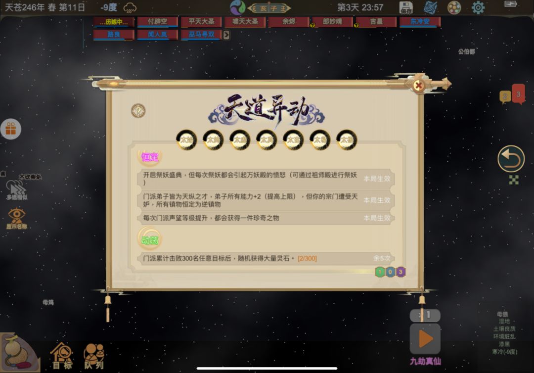 天道异动由地图种子恒定开局,这边我推荐对游戏有一定了解的玩家用种子:弑仙 下面说一下我个人的玩法思路: 前期主要围绕天道“妖祭盛典”进行以战养战,达到获取大量物资的目的。 开局老套路,画完神行分影伪符和一张历练相关的科技符,驻扎小凉山拿石髓,分别前往青莲剑宗,武当和天极峰摇人,金丹,元神一个不漏全部邀请回来。 准备工作做完三天后会有小人陆续做客,大能一半火烧,一半开自动反击保家 普通的金丹和元神期