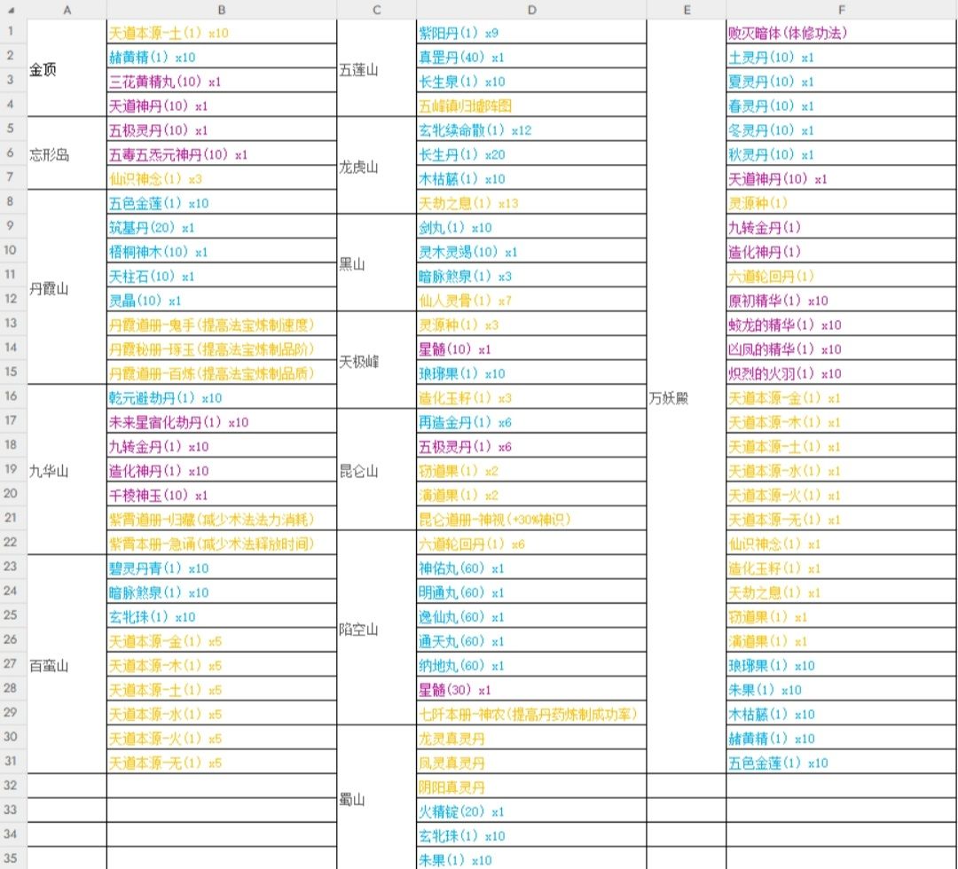 金顶 天道本源-土(1) x10 赭黄精(1) x10 三花黄精丸(10) x1 天道神丹(10) x1 忘形岛 五极灵丹(10) x1 五毒五炁元神丹(10) x1 仙识神念(1) x3 丹霞山 五色金莲(1) x10 筑基丹(20) x1 梧桐神木(10) x1 天柱石(10) x1 灵晶(10) x1 丹霞道册-鬼手(提高法宝炼制速度) 丹霞秘册-琢玉(提高法宝炼制品阶) 丹霞道册-百炼(提