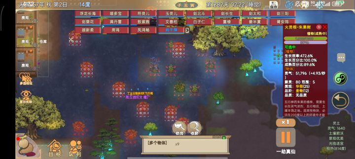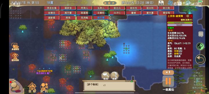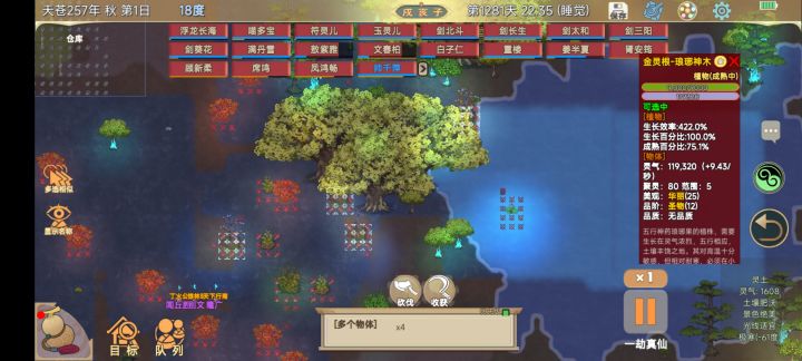 根据我的观察,我总结出了地图无限灵植树的方法,如图所示,当灵植成熟百分百,且生长效率在百分比往上后,不收取果实(非常重要)就能在未来一年内大概率分株,如果未在一年内分株,就要多等些时间,千年银杏树也是如此,我开局只有两株银杏树,但随着我的养护已经有6株了,木、水灵植需求较高所以我也暂时未见分株。成熟后提升成长效率的方法;放一两个天龙砂,有空闲时间每7天就放个天霖诀。批发种植虽然灵果多多方便炼制特殊