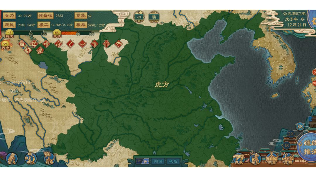 无敌路线,开局最好选择虎方,开局对巢宣战,巢没有士兵第一年拿下有几十万粮食,接下来收淮南,荆南,下面的吴,N多越国煽动他们打内斗,然后自己去积累人才、政策、预备役,上面联盟商,淮夷,周楚,下面联盟吴越共人等国,按战略陆续扩张 之后派使者去戎狄增加信任。用信任换取士兵,记得用一个130军略带恩义技能的将军,这样士兵越打越多,后续政策随机点 后妃娶淑,丽。良人不是属性特别好千万别娶,影响后代!娶多了花的比军费还高,不给钱还加朝堂猜忌