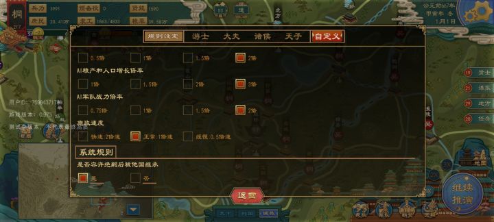 八,附庸,我方是别国附庸,脱离方法:礼府里相王,宣战名目里的战争,朝会里有概率触发脱离,找近的小国打战、求和成为小国附庸脱离大国附庸、后面打小国脱离附庸。