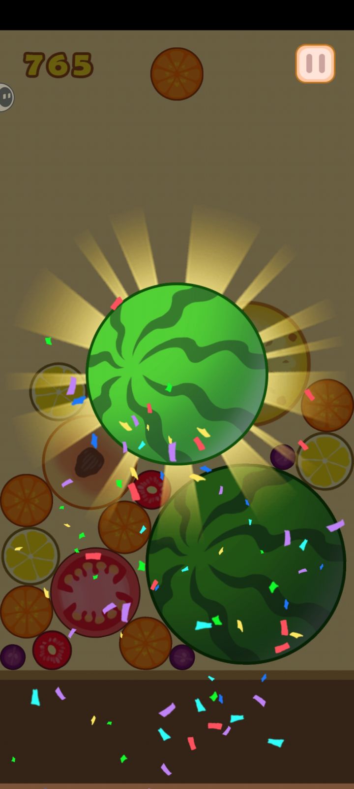 停停停这里怎么悬浮了?大气压强吗?怎么还能挤成这样?就是西瓜下面那块,本来西瓜是落地的,后面两边水果合成把它挤上去了,我也因此输掉了比赛