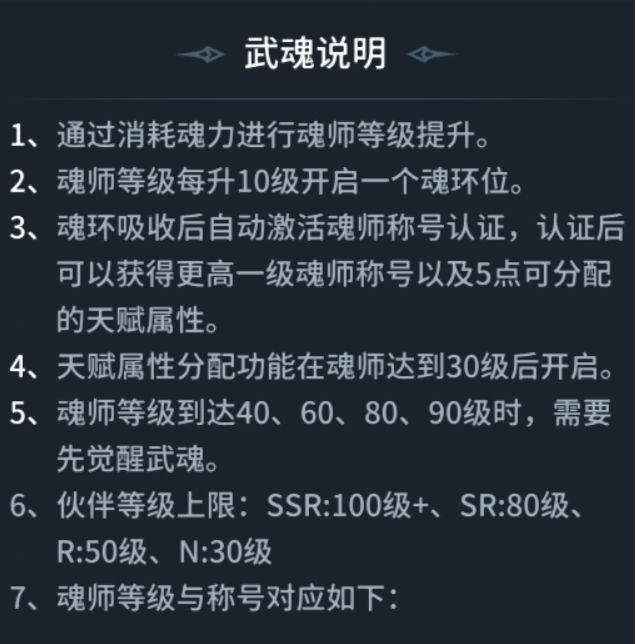 以下观点,适用群体有限。如有错误,欢迎指正。如有疑问,欢迎提问。本篇攻略的主题是按自身意愿选择自己的魂环,但会穿插别的内容辅助我讲解。目录一、魂师的选择二、阵容的选择三、魂环的作用四、魂环的获取五、魂环的选择篇幅较长可以根据目录选择性观看一、魂师的选择武魂说明如上图。我取其中比较重要的点强调一下1.魂师品质决定魂师等级上限SSR:100+SR:80R:50N:3