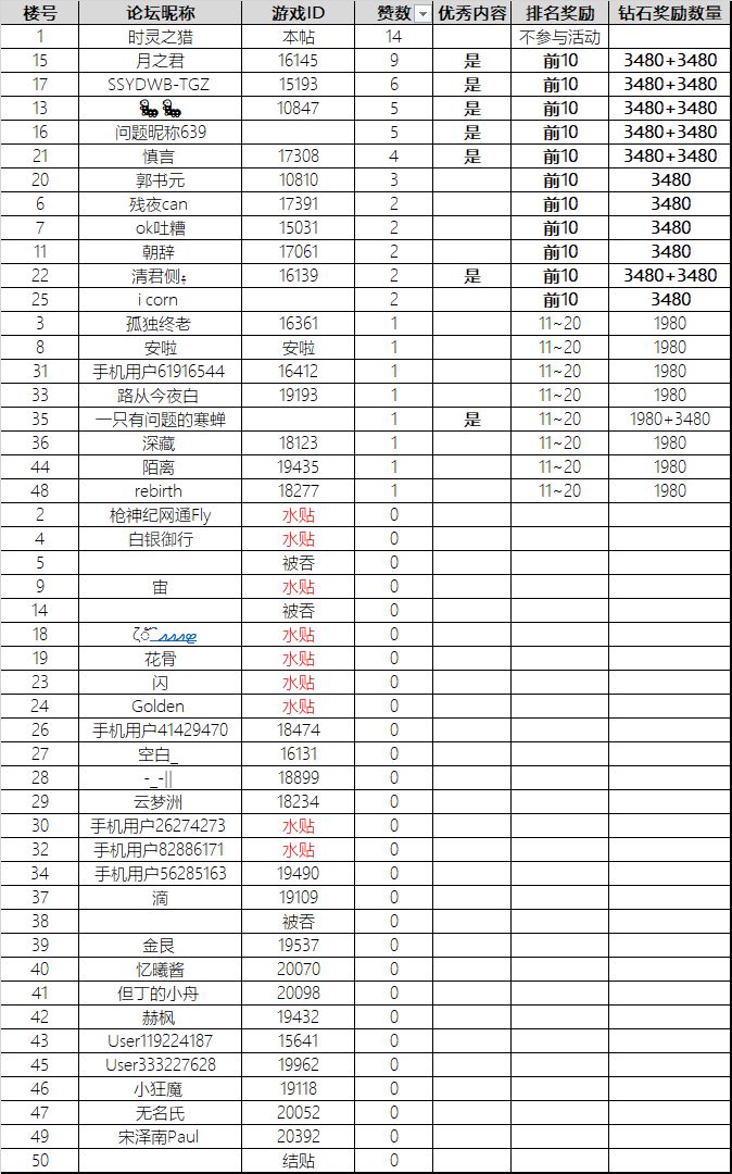 重复发帖已被删除。水贴玩家可以领取发帖奖励,但是不能参与点赞排名奖励。请各位中奖玩家进官方QQ讨论群:921145934,私聊群主领奖。