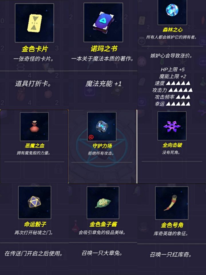 火商店专属,混沌杖,恶魔血,命运骰子,金色号角,火之心,扣血上限道具几率高(如,恶魔披风,嗜血手套,鬼面具)冰商店专属,魔灵杖,金色鱼子酱,诺玛之书,全向击破,雪莲花,加血上限几率高(如,神泉水,女神的祝福)雷商店专属,雷杖,悠悠球,守护立场,小猪储蓄罐,超导体,药水类道具几率高(如,力量药水,速度药水)冰火雷商店通用,三个金色戒指,所有领域,永恒之盾,金色卡片,森林之心如有错误概不负责!