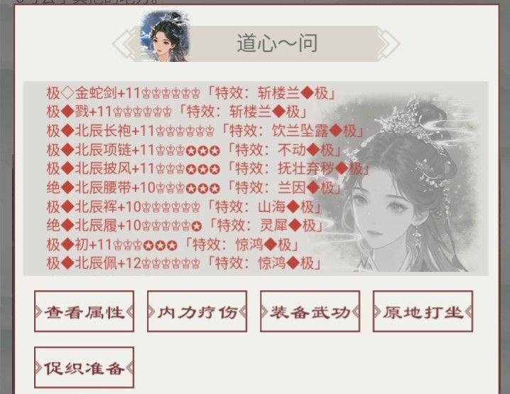 无论是“挥剑破云迎星落,举酒高歌引凤游”的侠情意志,还是”袭青衫一白驹,一柄长剑闯天涯”的江湖豪情,相信在你的心中也沸腾着成为英雄豪杰的热血,披荆斩棘,响彻江湖。装备攻略分享关于装备游戏内四大套装:属性套——天北辰套(通过无锡铁匠处锻造获得,锻造配方攻略群文件直接搜索“锻造”查看,也是大部分玩家使用的套装,锻造时务必要按攻略配方顺序放入材料/装备)连招套装——无垢套(通过杀无垢界通缉之人获