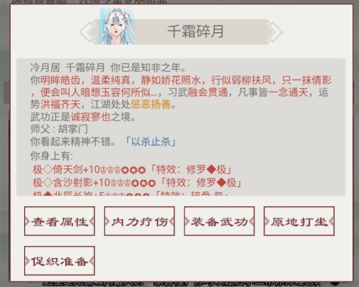 “一点浩然气,千里快哉风” 五月来武林享受古色古香的“人文景色和茶点美食” 与高手切磋拜师学武,飞石射鱼采集草药,品尝佳肴美酒,行于山川纵马闯荡,和英雄侠女除恶扬善。一人一剑,踏遍整个江湖。干货分享-关于出身:1. 武林世家自带一把可升级的家传宝剑,升到最高级属性比顶级武器属性略高一点,且升级消耗比锻造天倚天剑少。家传宝剑不能幻化成专属武器(某些武功有专属武器,比如太极剑法的专属武器为真武剑。