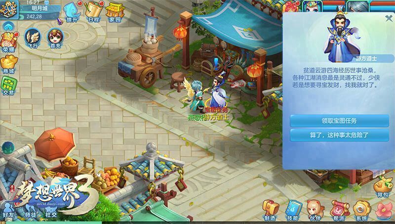 阶段重要内容 宝图任务 等级限制:达到25级单人任务:去找明月城的游方道士打探贼王的下落,打败贼王获取他们身上的藏宝图!你可以根据藏宝图提供的线索获取宝物! 侠客任务 等级限制:达到25级单人任务:侠客任务是日常获得银币和帮贡的途径,通过解决梦想大陆上发生的各类随机事件即可获得银两和银票,银票上交可获得帮贡和帮派资金 海市贸易 等级限制:达到30级单人任务:增强实力可以在修炼技能方面下功夫,海市贸