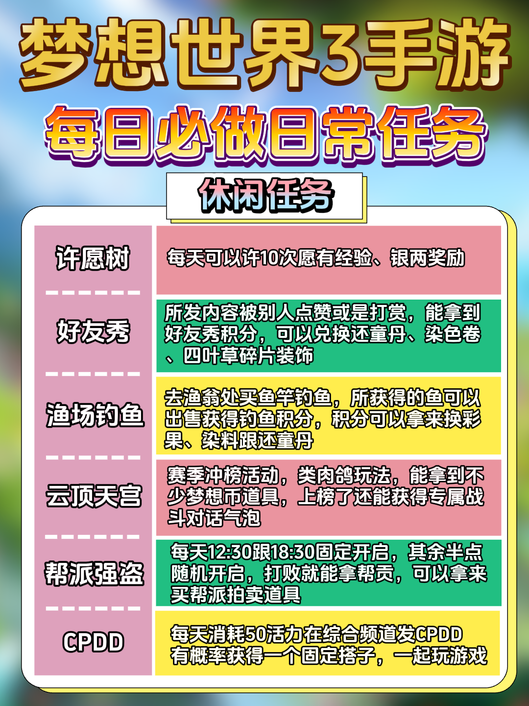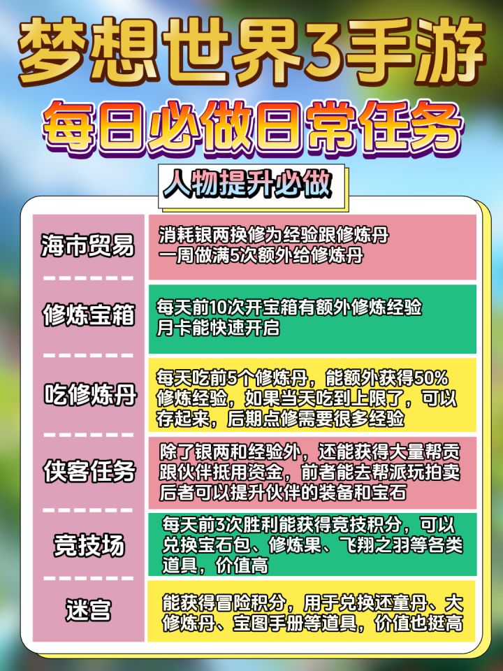 整理了一份必做任务清单,大家可以对对看有没有漏做的~#梦想世界3#游戏攻略#萌新攻略#梦想世界3攻略#mmorpg#每日任务#游戏分享