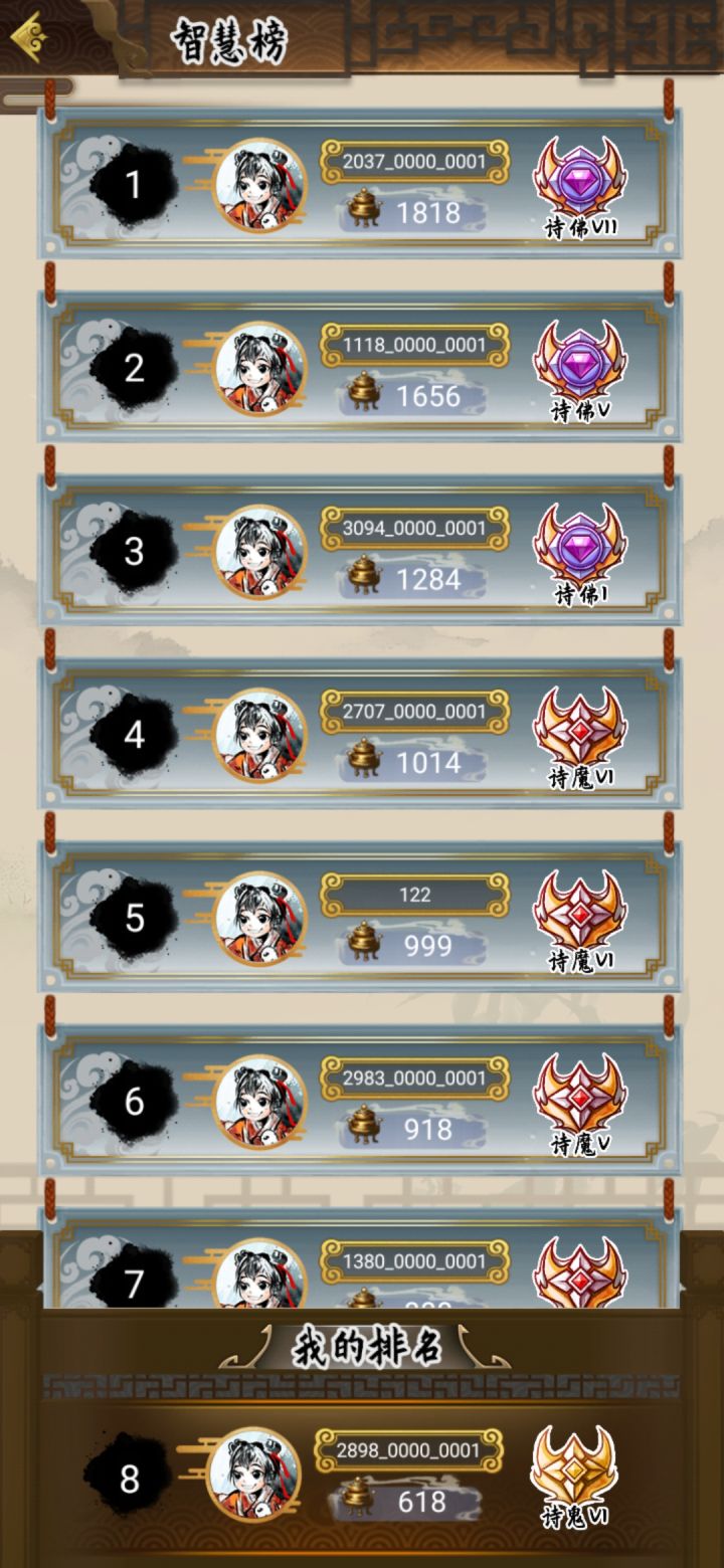 哈哈哈~咱的独立游戏诗奕道.测试服上线两周啦~昨天本大神的榜首排名被道友给打下去了~发帖庆祝下哈~小伙伴们来玩了吗?还没来的小伙伴快来吧!taptap搜>诗奕道(测试服)id:1118前缀的就是本大神啦~