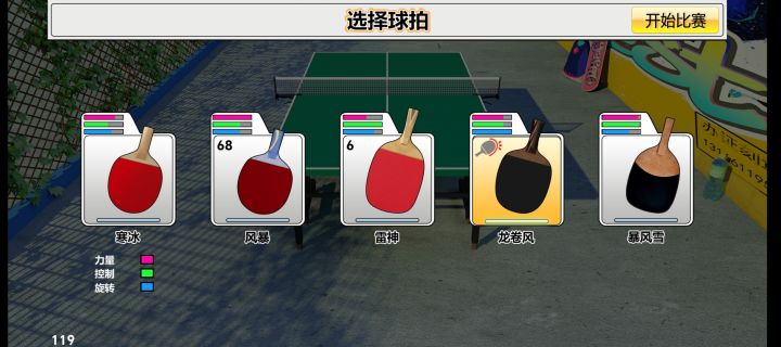 虚乒一共有五个球拍,每个球拍都很有特色,分别是最初始的小红,最暴力的风暴,最磨的雷神,最拐的龙卷,和暴风雪。