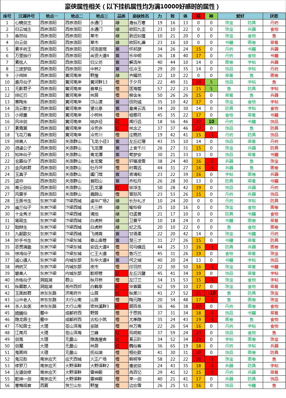 发布攻略啦~全豪侠挂机属性,位置,人际关系,喜好厌恶,品级。