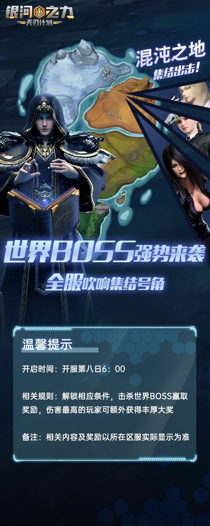 指挥官,进击酱监测到了危险信号世界boss降临混沌之地,噩梦即将来袭,请指挥官做好作战准备# 降临时间:开服第八日6:00# 参与形式:副本挑战进击酱小提示:1、世界boss战力很高,指挥官挑战时可以召集协助2、中途退出不计算挑战次数,每天可获得3次挑战机会3、艰难的挑战背后是丰厚的奖励,请务必先提升英雄战力和等级再参与