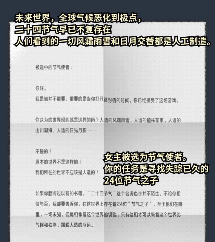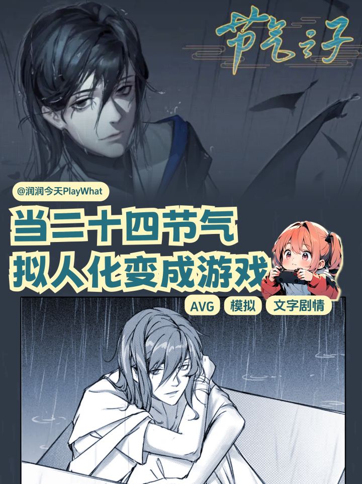 偶然发觉的一个非常有意思的游戏!设定是世界末日,随着自然随着开发被严重破坏,全球气候恶化到了极点,人类能感受到的风,雨水,光全部成为了人造的虚假数据,二十四节气已经彻底消失,而我们的女主,接到了一个特殊的任务……她将重新寻找到,由二十四节气拟人化形成的节气之子……这个设定非常讨喜,以传统中国文化元素为背景,结合非常深刻的环保教育意义,美术风格上的话更像是看了一部动漫(这个画风也很戳我),当然我最