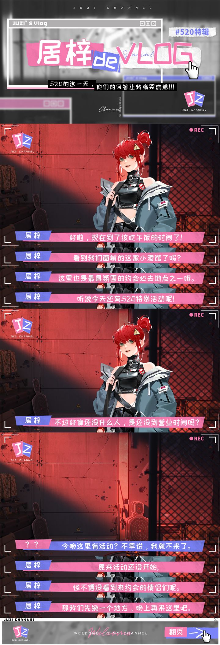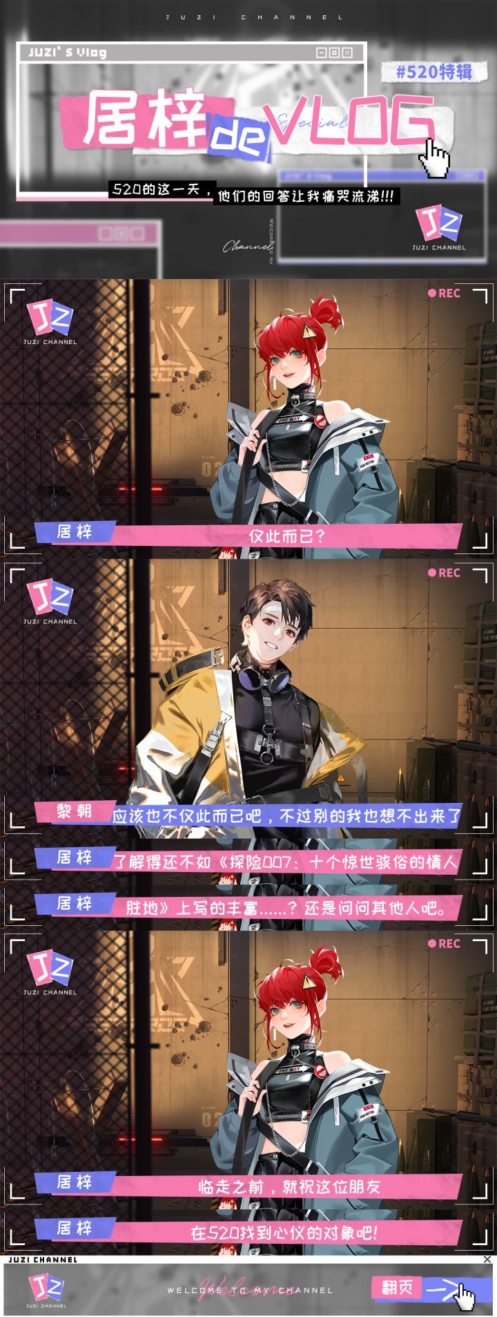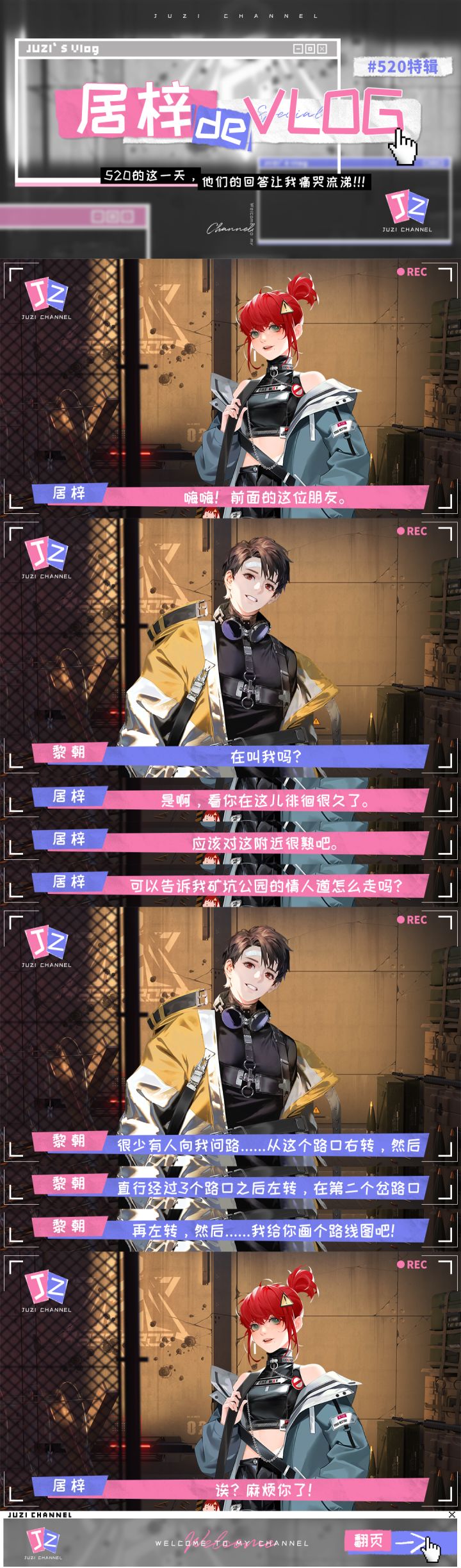#最后的厂牌520特别企划#【居梓de VLOG x 007城之黄衣小哥篇】目前在007城探险的「居梓」,会用摄影机记录自己的探险日常,而这次也特别制作了520视频特辑!想知道007城居民是怎样度过520这一天的吗?又是什么让居梓直呼“他们的回答让我痛哭流涕”呢?街采第一位——黄衣小哥居梓究竟能否从这位帅气小哥口中得知无人区约会圣地「情人道」的具体位置呢?赶紧点开下图一探缘由吧,小编也很好奇哦!