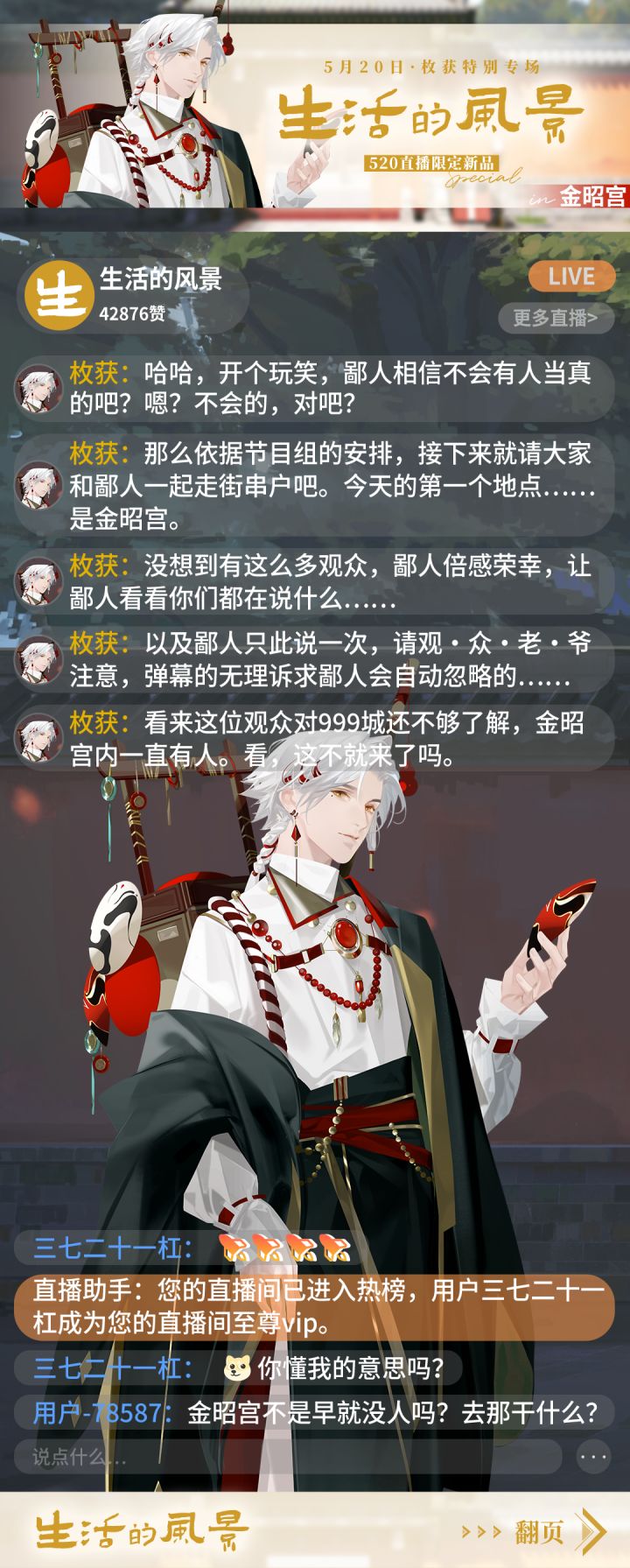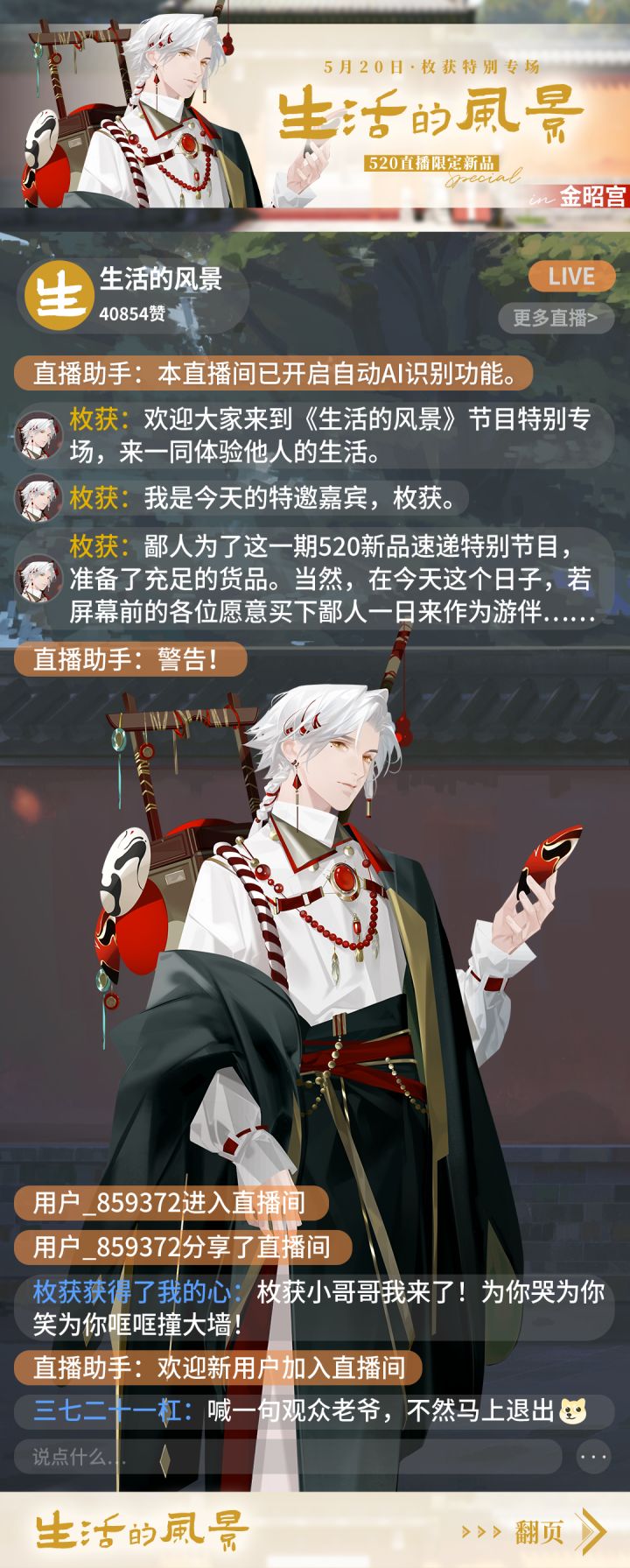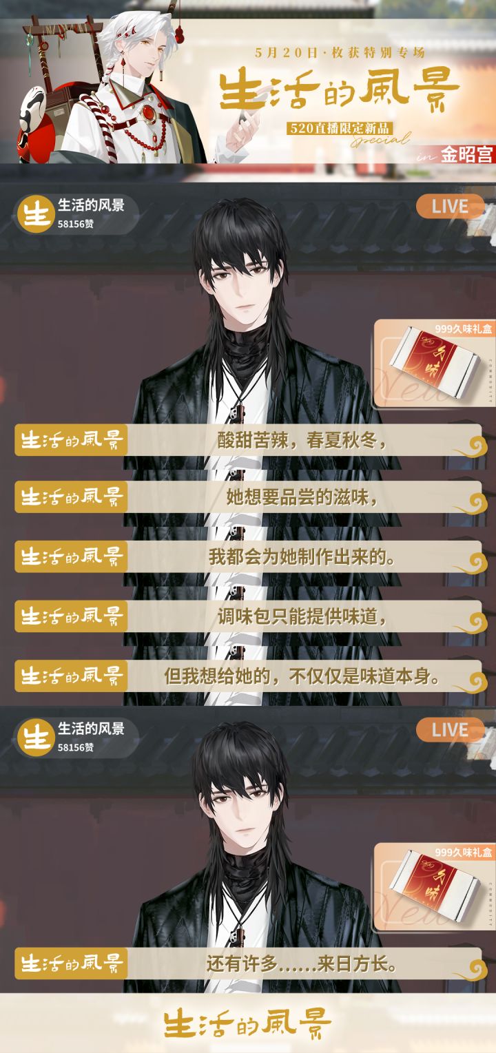 #最后的厂牌520特别企划#【枚获x生活的风景之金昭宫篇】999城知名卖货郎——「枚获」先生首次直播亮相!携手《生活的风景》栏目为大家带来520特别新品和爆款好物!「生活的风景」栏目一直致力于为观众带来荣峥城居民的日常生活光景,这次跨界联动会带来什么惊喜呢?快点开下图看看吧!第一站——金昭宫在这里枚获先生遇到了谁?又能否顺利把超值520新品推销出去呢?速来围观!一睹为快的小编只想说——好像有点道理!
