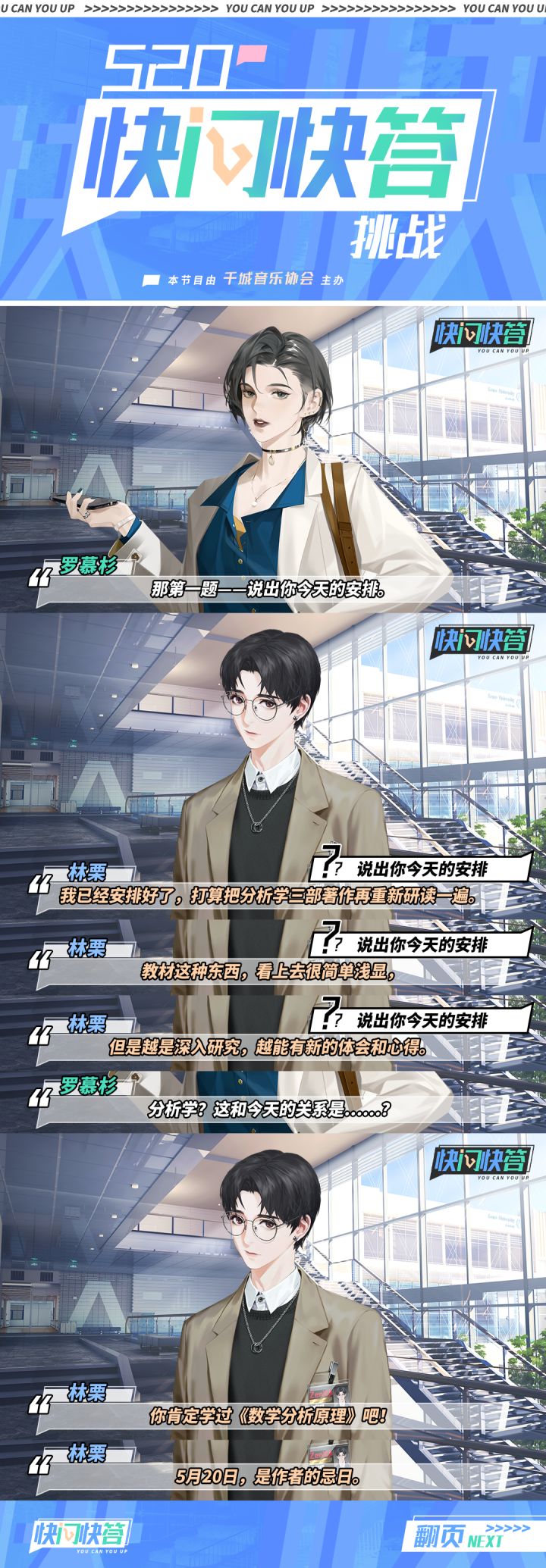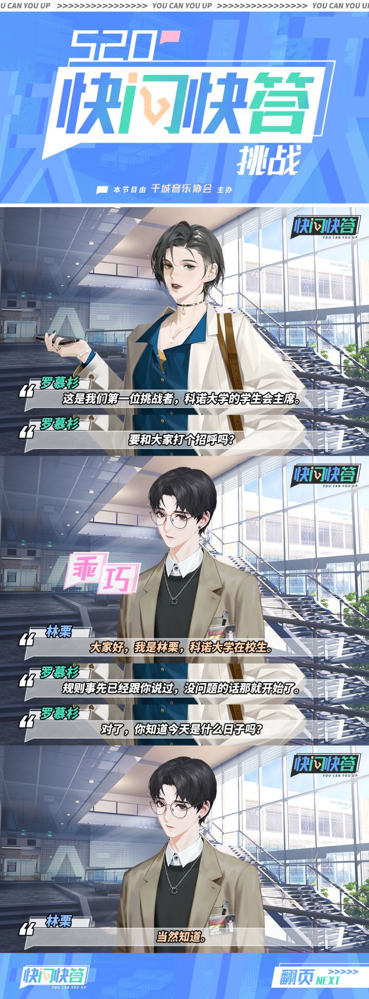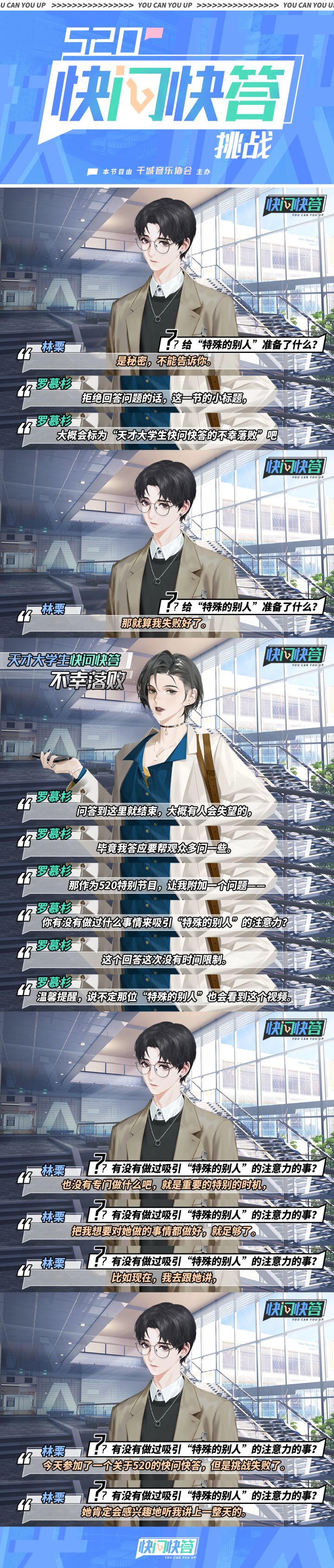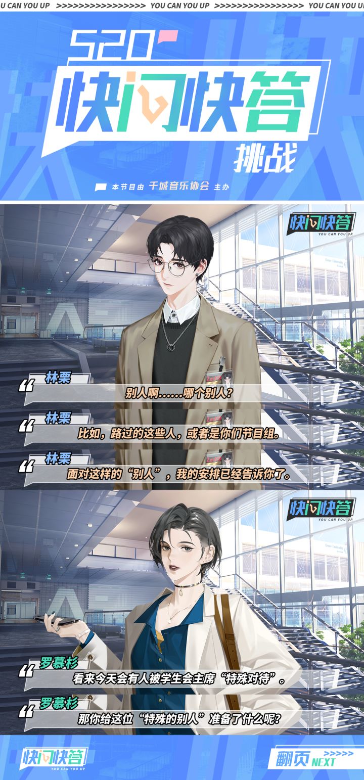 #最后的厂牌520特别企划#【520快问快答挑战之天才大学生篇】由000城音乐协会举办的「快问快答挑战」520特别篇正式上线!据说音协这次下血本邀请了三位公众人物作为挑战者!根据以往的规则,嘉宾必须在3秒内不假思索地给出答案,否则就视为失败!那这几位大家所熟知的挑战者是否能挑战成功呢?让我们拭目以待!挑战第一位——科诺大学的学生会主席520这个特殊的日子,在天才学霸的眼中,会与我们有什么不同吗?动动手指点开图片,一切尽在不言中。