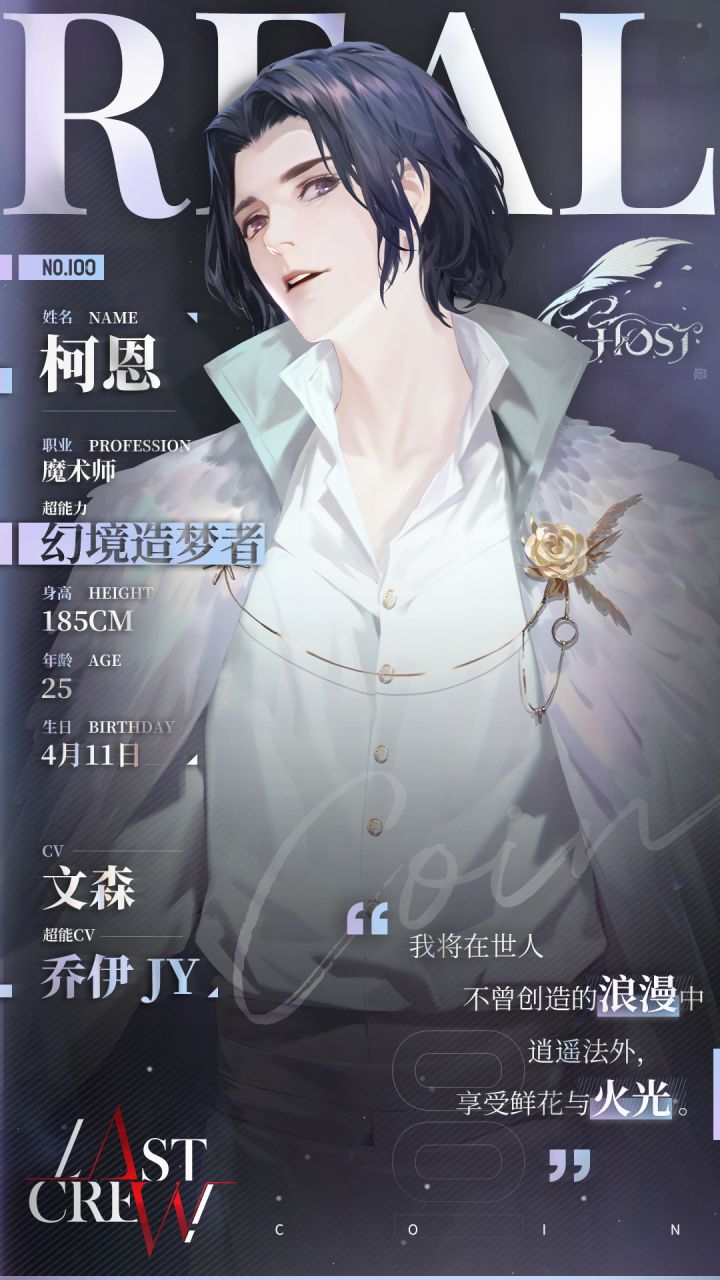 「我将在世人不曾创造的浪漫中逍遥法外,享受鲜花与火光。」姓名:柯恩城市:REAL CITYCV:文森@文火炖森蘑超能CV:乔伊JY@罗乔伊Joy职业:魔术师年龄:25岁身高:185cm生日:4月11日超能力:幻境造梦者【已收集个人经历记录】他称自己为魔术师Coin,真实身份无从查证。关于他的调查只能追溯至千城会议后,他开始在100城内活跃。他每次出现都伴随着视觉上的幻境,目