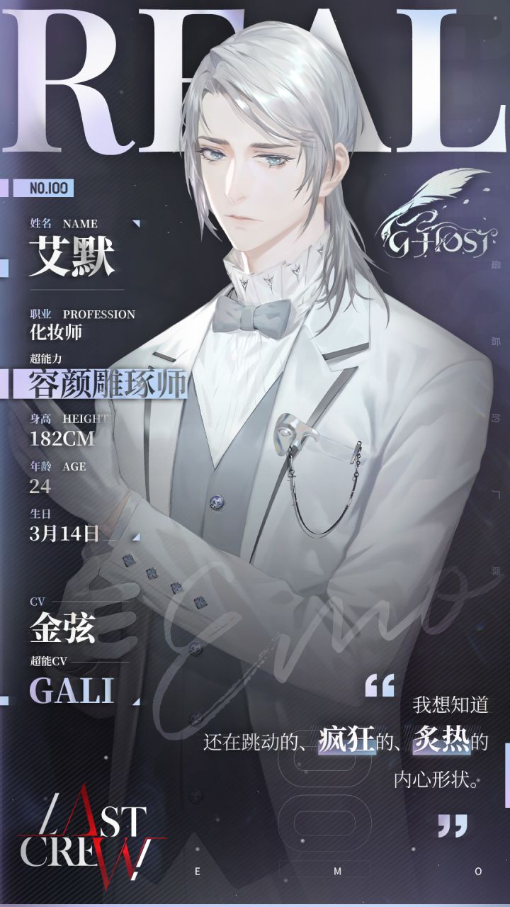 「我想知道还在跳动的、疯狂的、炙热的内心形状。」姓名:艾默城市:REAL CITYCV:金弦@金弦North超能CV:GALI@GALIGALIGALI职业:化妆师年龄:24岁身高:182cm生日:3月14日超能力:容颜雕琢师【已收集个人经历记录】艾默是100城核心区的百位“完美”艺术家之一。他出生于艺术世家,但出于不明原因,他尚未成年便离开了父母,独自定居于LOCA城——