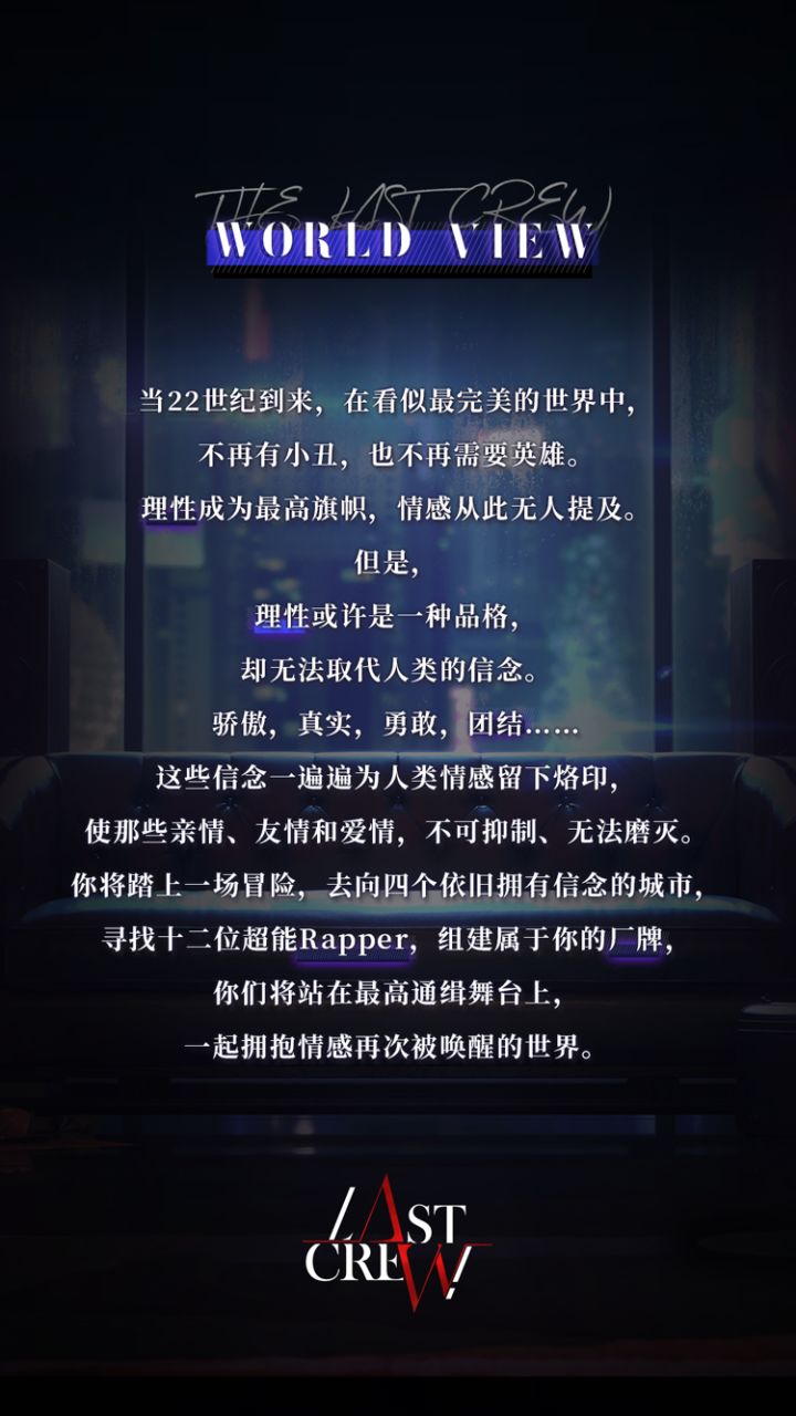当22世纪到来,在看似最完美的世界中,不再有小丑,也不再需要英雄。理性成为最高旗帜,情感从此无人提及。但是,理性或许是一种品格,却无法取代人类的信念。骄傲,真实,勇敢,团结……这些信念一遍遍为人类情感留下烙印,使那些亲情、友情和爱情,不可抑制、无法磨灭。你将踏上一场冒险,去向四个依旧拥有信念的城市,寻找十二位超能Rapper,组建属于你的厂牌,你们将站在最高通缉舞台上,一起