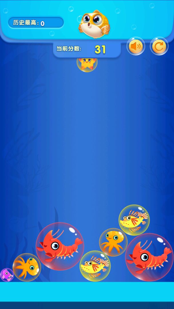 一款超级有趣的休闲合成类游戏,滑动屏幕相同小鱼可以合成更大的小鱼。并且还能获得相应积分,您可以超过上局的积分吗?