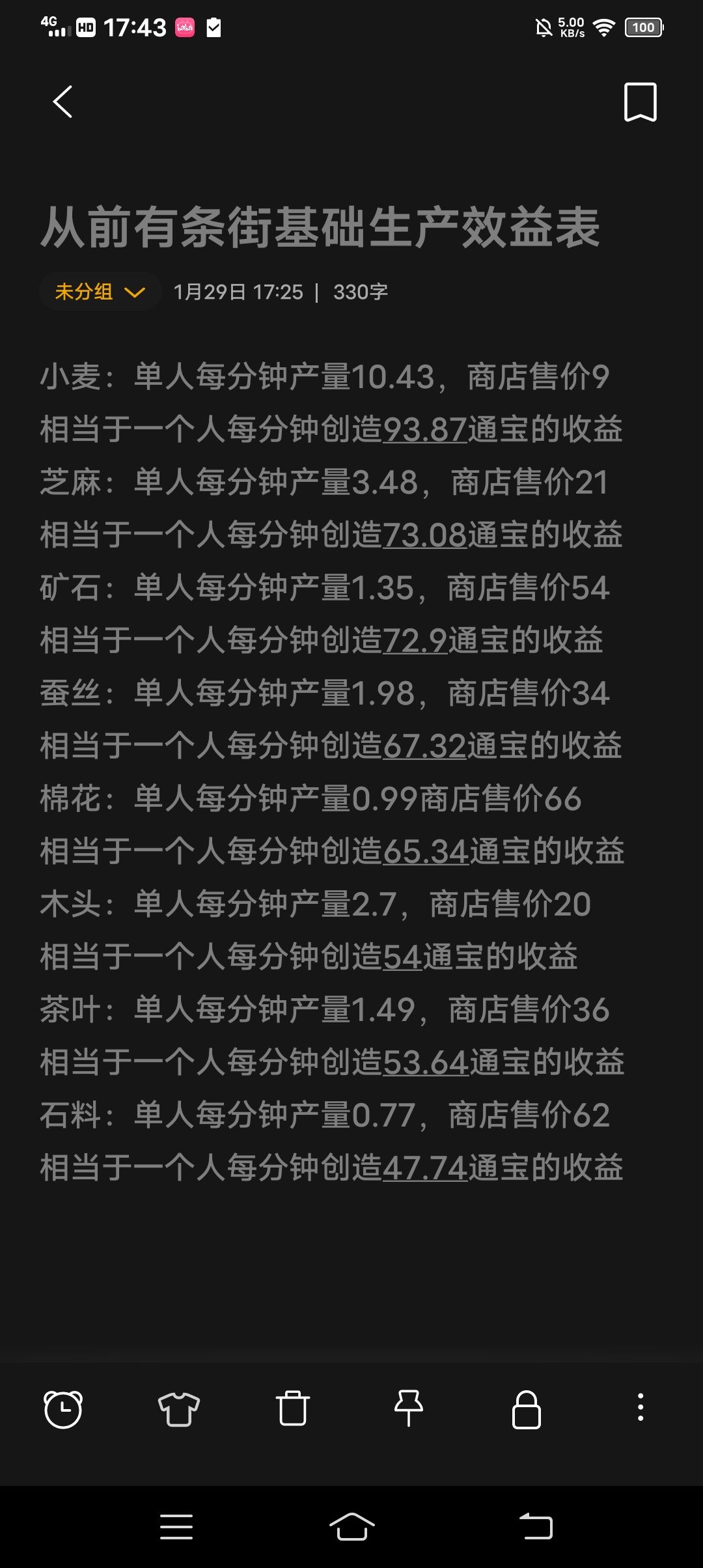先贴一张自我介绍,欢迎小伙伴加我聊天玩,正式服女宿街,社团暂满。 肝(+氪)了两天拿了第一称号之后,开始咸鱼养老生活,于是研究起了游戏的收益计算,对于我来说最有意思的莫过于看数字慢慢增长了。 以下内容欢迎转载,转载请备注出处和作者姓名。 先给大家看一张现阶段的产物价格表吧(由于我没内测过,所以只做到42级为止的开放产物的价格,后续可能会更新到这个云文档上面。 (【腾讯文档】《从前有条街》收益计算教