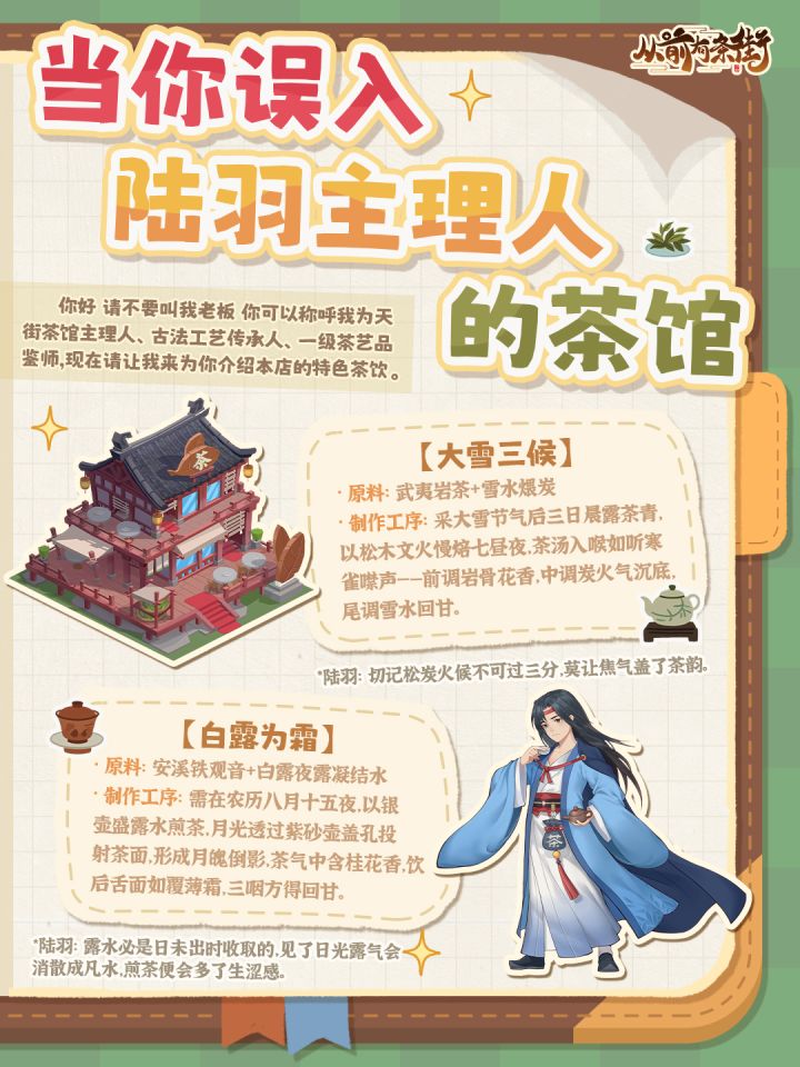 谁能想到,天街新开的茶馆,主理人竟然是茶圣陆羽!从原料到古法工序,从茶汤意境到茶器风雅,在茶馆喝的每一口茶都是极致的享受,沉浸式品茶体验直接封神~听说还能解锁陆羽手作限定——【大雪三候】和【白露为霜】!难怪现在茶馆已经排起了长龙,这就是主理人的魅力吗~陆羽主理的茶馆,你最想先打卡哪一杯限定茶?评论区在线蹲一位品茶搭子~#从前有条街 #模拟经营
