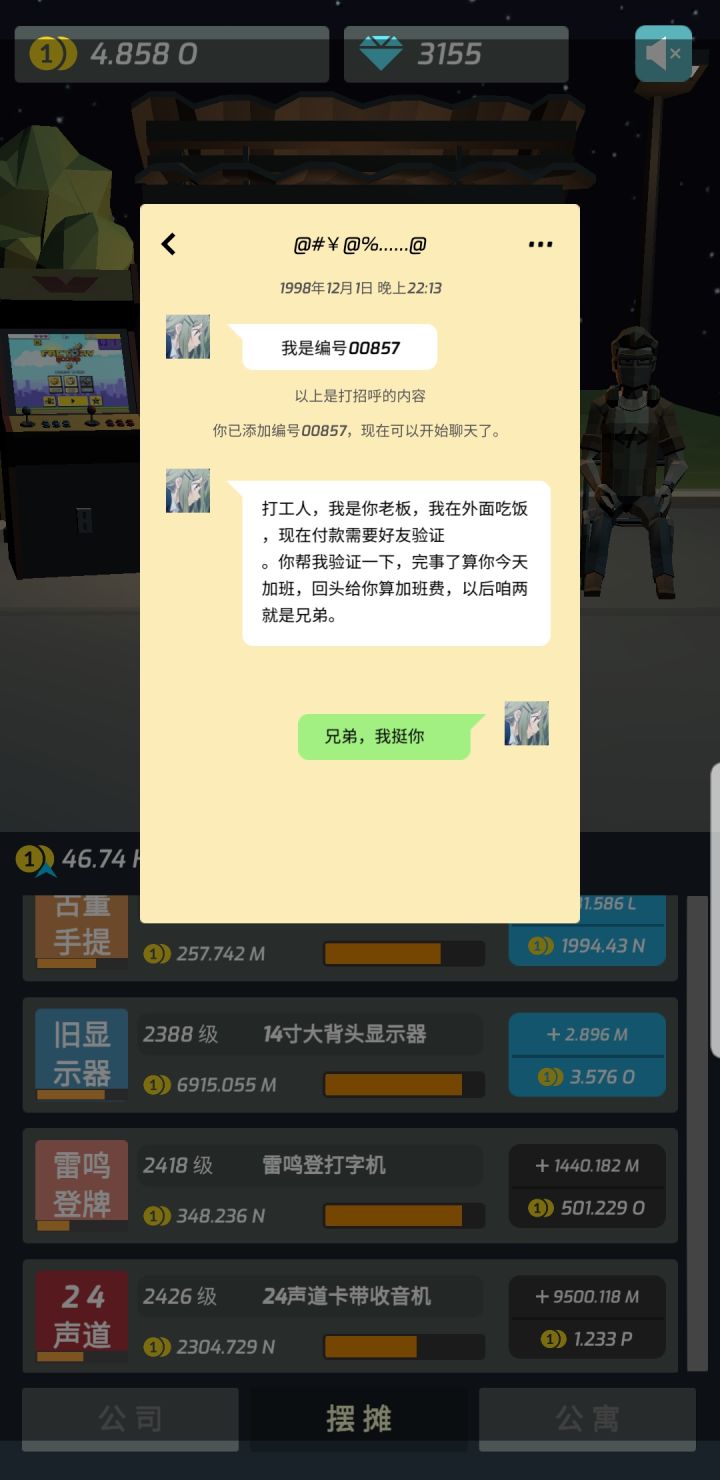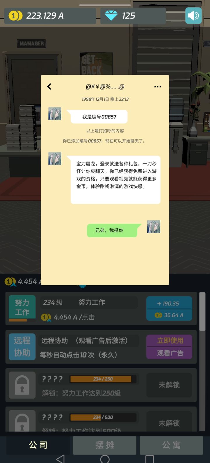 新年第一个flag祝各位打工人牛年牛皮轰轰,红红火火,没有加班,双休正常!!!1、感谢大家反馈的意见,游戏会持续优化和更新更多的玩法;2、最新版本加入了声音开关按键;3、删除了让人厌烦“加班OT”,新增“远程协助”自动点击效率翻倍,帮助各位打工人更容易解锁点击成就;4、修改“多劳多得”报酬,变得更加丰厚,而且还是永久有效;5、“年终分红”也变得更加吸引;最后,希望大家持续提出好的建议