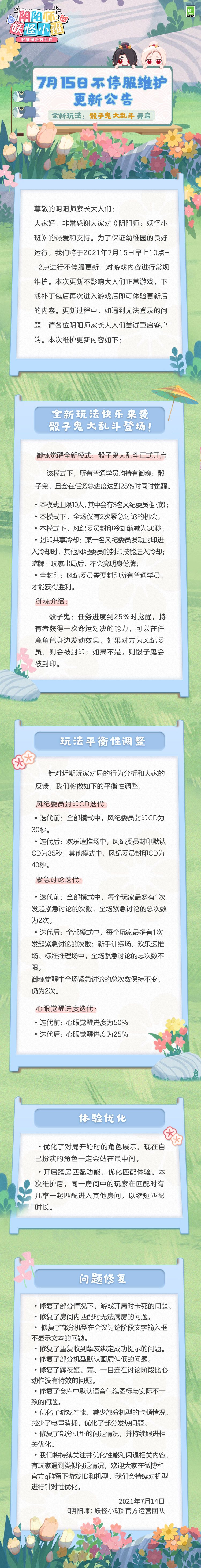 家长大人们晚上好~ 为了保证幼稚园的良好运行, 我们将于7月15日10:00-12:00, 进行不停服更新。 全新玩法骰子鬼大乱斗登场! 还有风纪委员封印CD、紧急讨论、 心眼觉醒进度都做了迭代哦~ 来和小话痨一起看看明天的更新公告~