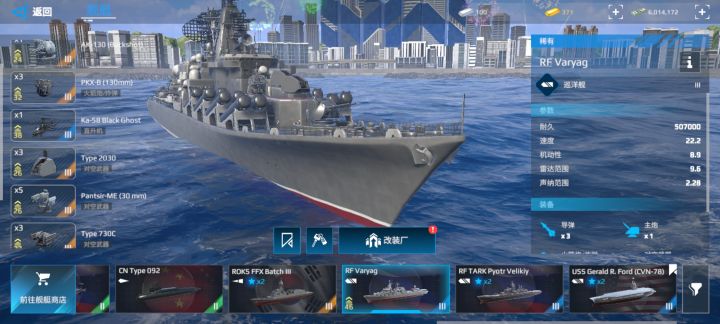 瓦良格-苏系拥有3导弹单元,1主炮单元,3火箭弹单元,1直升机单元,以及恐怖如斯的11防空单元,其中一个防空槽能直接放5个单元,安装性价比高导弹:S-500可打击水面及空中目标,装填快,单轮数量多,量大管饱面对水面目标时能骗点杀伤的防空导弹,单枚导弹耐久高,装填快,实现饱和打击。闲下来还能距打击空中目标,打✈老快乐了技巧:对海时可利用其装填快,量大的特性,骗诱,然后配合其他制导武器输出至
