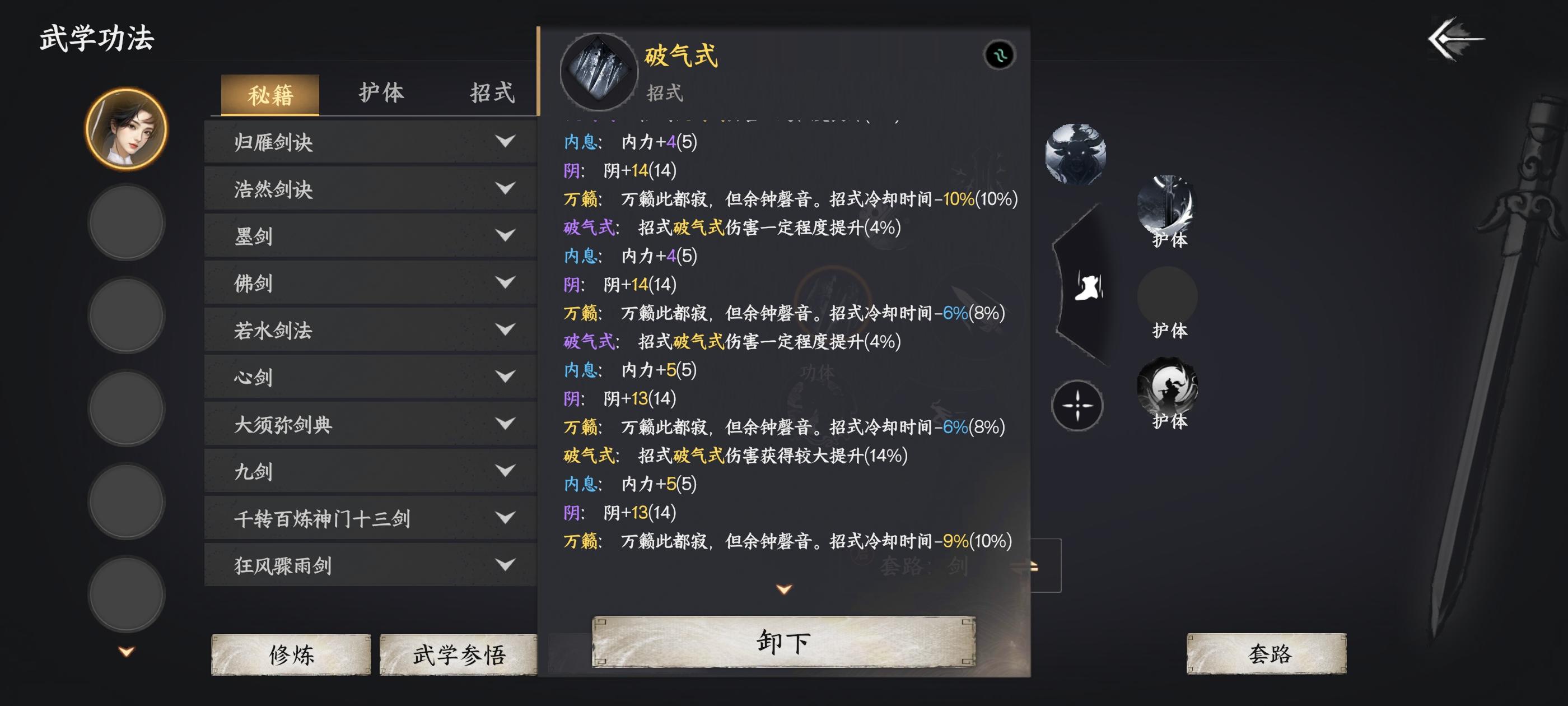 现在打怪刮死了,一千多管血的要打几分钟。招式是九剑两件套➕牛金牛➕太极剑,功体就是吞天,洗的天籁➕内息➕阴属性。经脉全洗的内息,装备还没弄,随便带的金色七阶一套。我现在想问问我后面是升诛心还是接着升内功还是升阴属性,经脉秘卷选择哪种属性的,还有装备弄哪种属性的,招式要不要换换。现在玩的特别迷茫,看别人几千管血boss几下就秒了