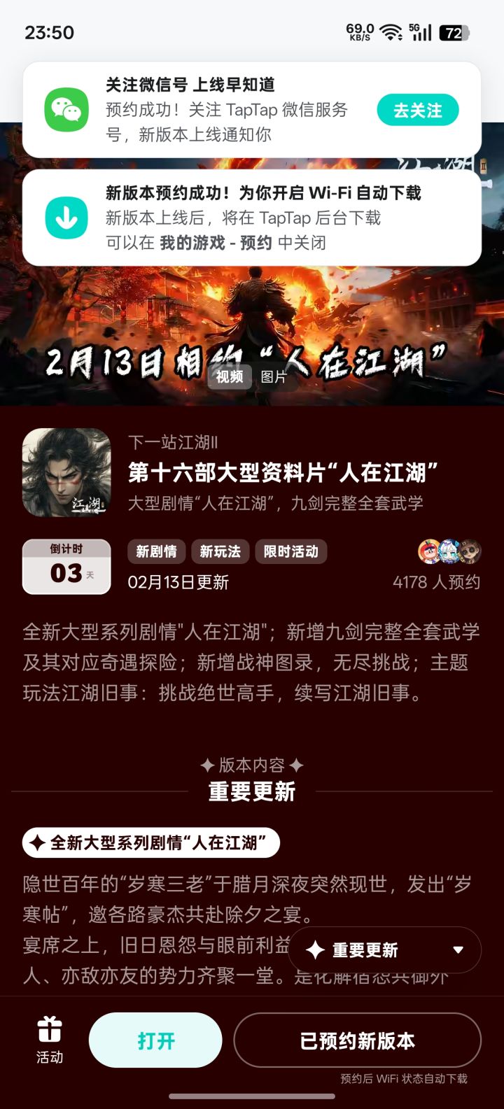 参与人在江湖预约活动免费获得武器特效和外观礼包