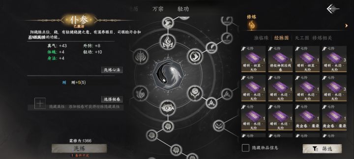 -用大经脉书(大经脉:每条经脉最后一个),打到小经脉上(小经脉:每条经脉前面的小圈圈),直接无敌。-操作方法:点到对应大经脉,然后点洗练经脉,这是右侧弹出的窗口中可以看到大经脉书,然后点击其它地方让洗练经脉的窗口消失,然后点任何一个小经脉(此时不要再点洗练经脉),此时经脉书的窗口还在,直接选中大经脉书就能洗练,直接把大经脉书打到小经脉上了,8❌8=64,直接无敌,什么威力、拳剑冷却、破防、内外功