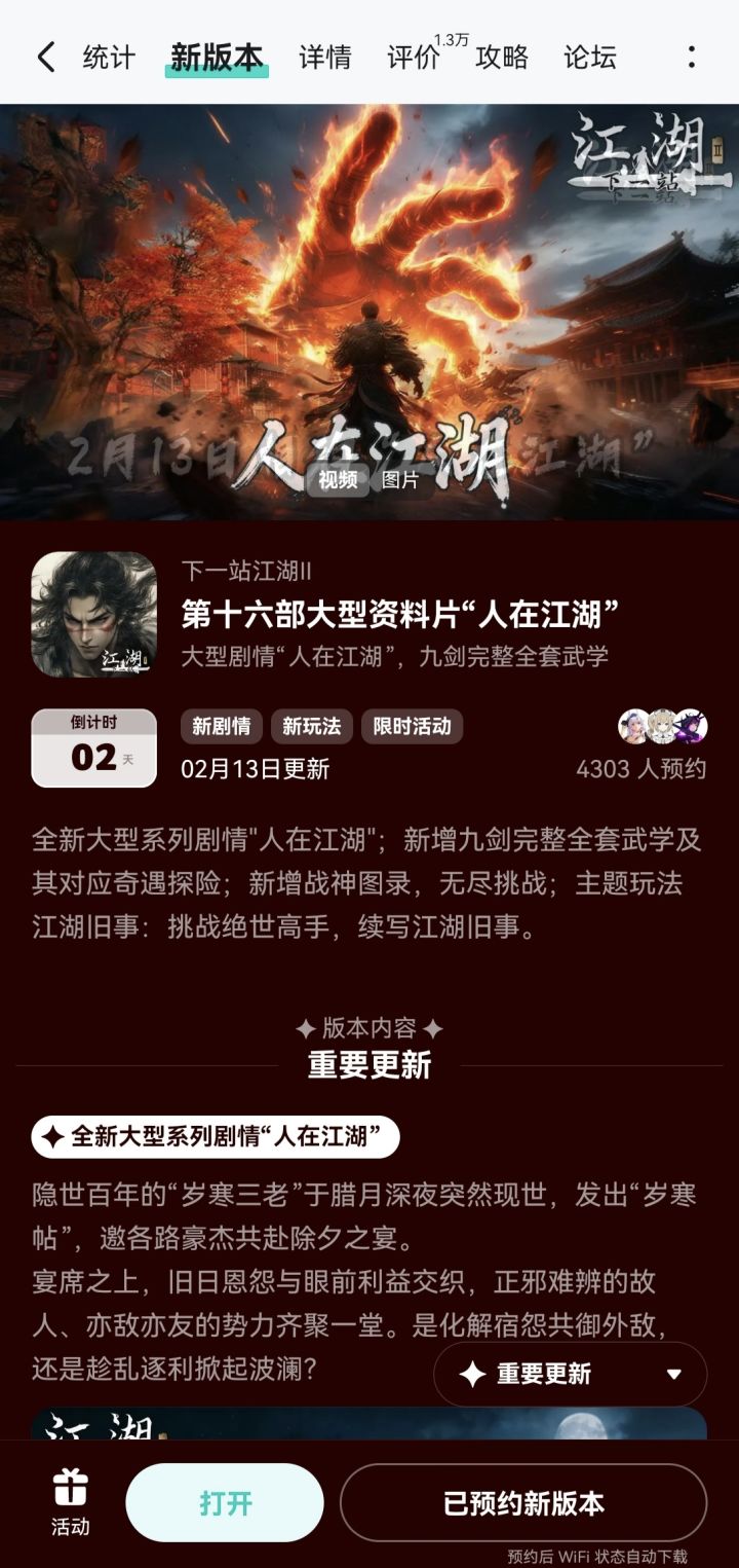 《下一站江湖Ⅱ》贺岁资料片暨第十六部大型免费玩法资料片“人在江湖”发布各位大侠好, 纵马江湖间,福运自绵延!马年新春,我们为大家奉上《下一站江湖Ⅱ》第十六部大型免费玩法资料片“人在江湖”。 白玉京全体成员在此预祝大侠们马年新春快乐!一马当先,好运连连;马到成功,心想事成! 《下一站江湖Ⅱ》第十六部大型免费玩法资料片“人在江湖”暨移动端38更、PC端155更公告更新时间:2026年2月13